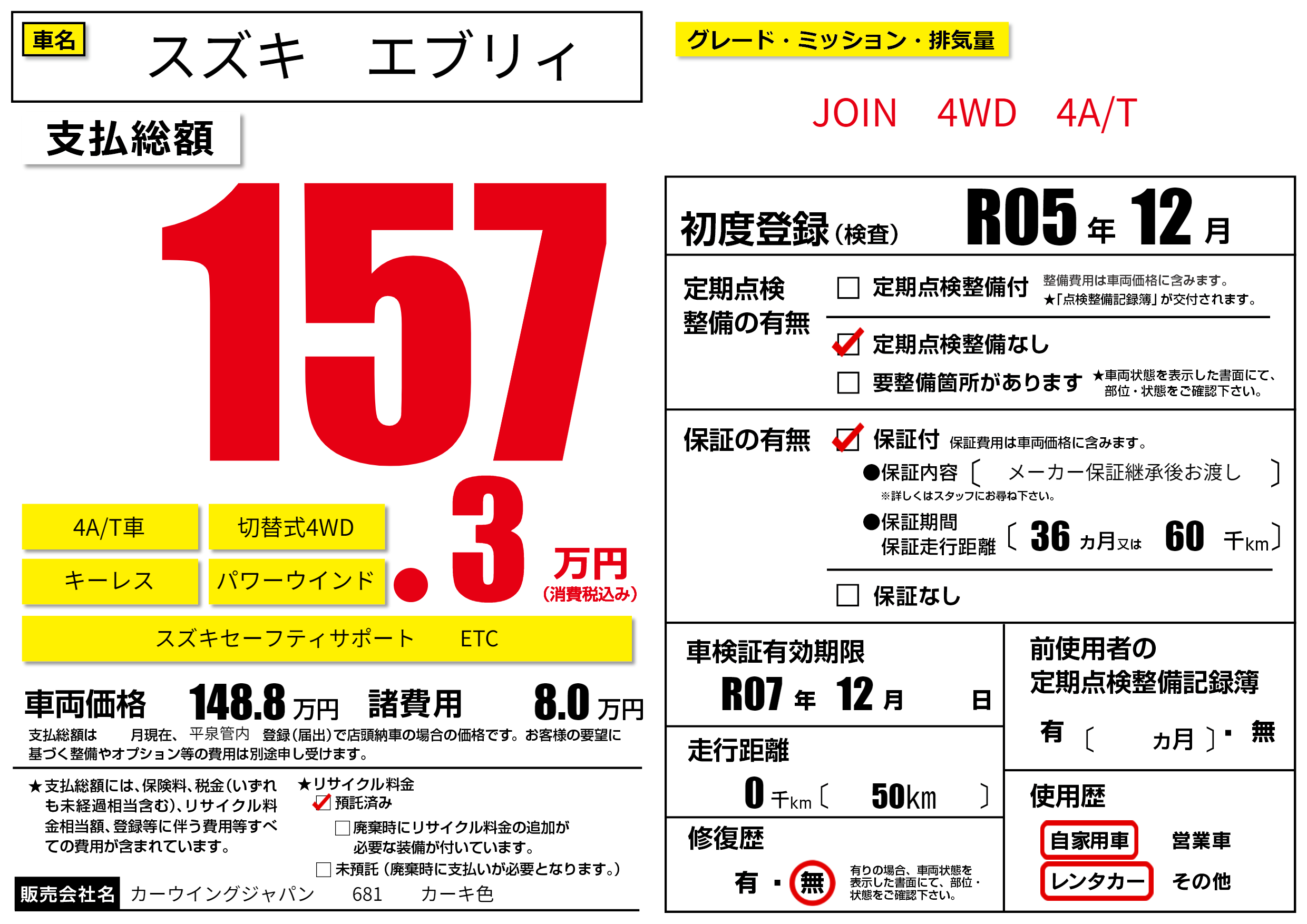 | 車名 | スズキ エブリィ | グレード ミッション 排気量 |