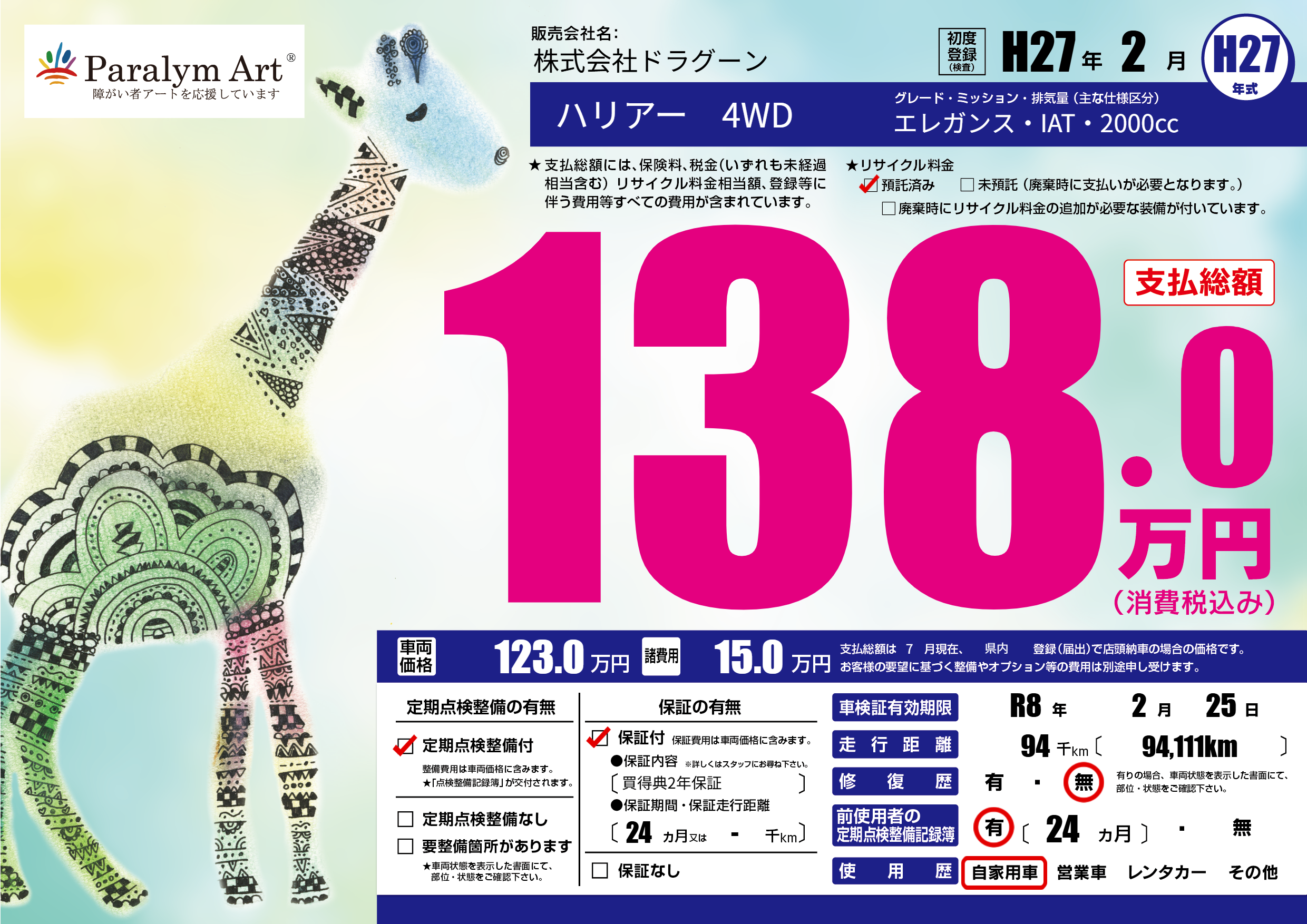 | 走行キロ | 9.4万km | 初年度登録 | H27年2月 |