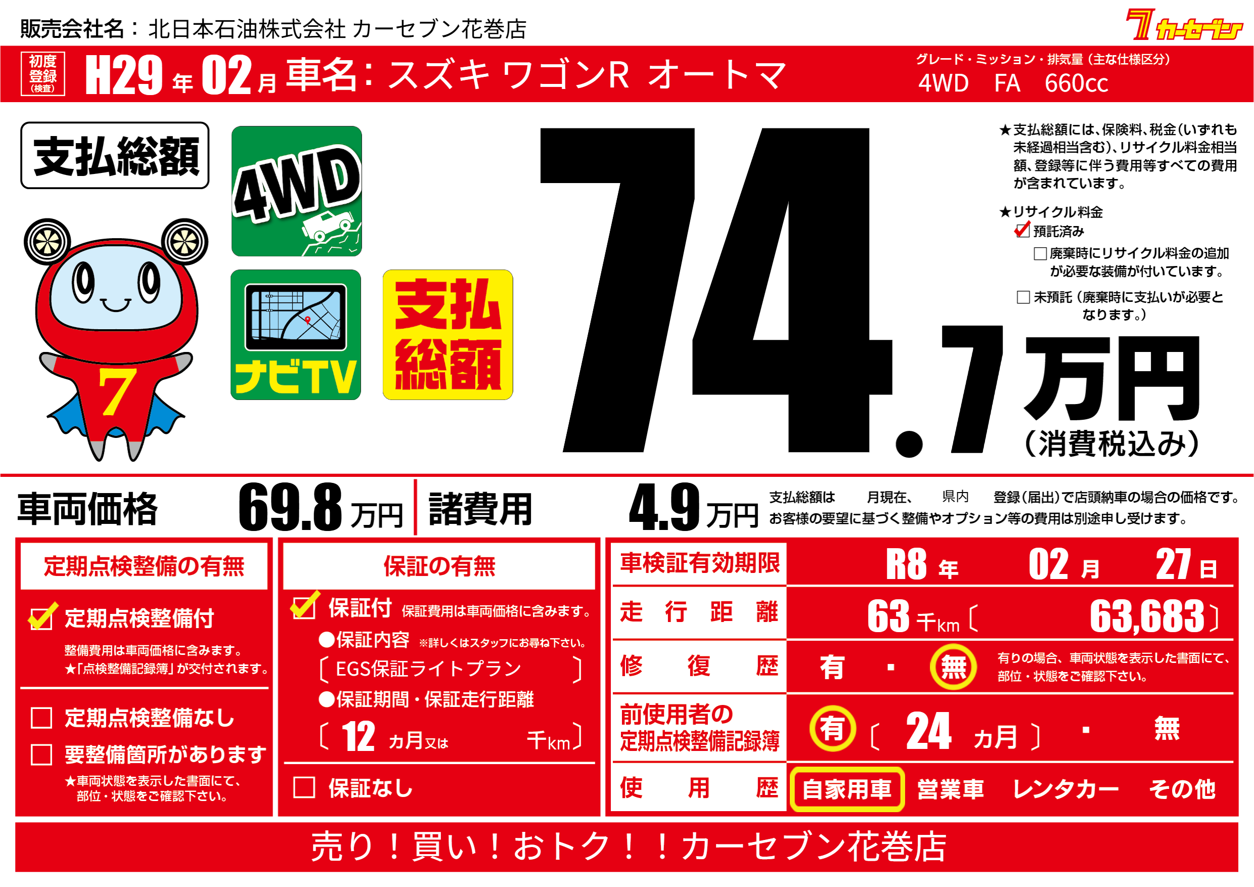 | 走行キロ | 6.3万km | 初年度登録 | H29年02月 |