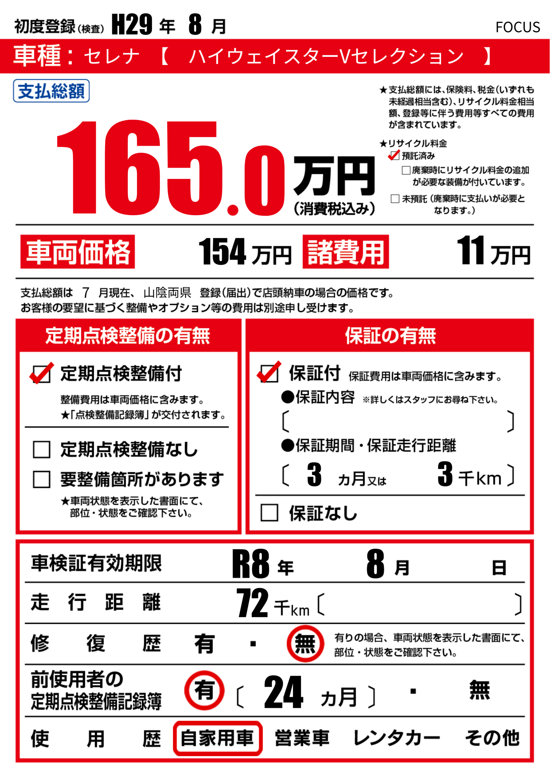 | 走行キロ | 7.2万km | 初年度登録 | H29年8月 |