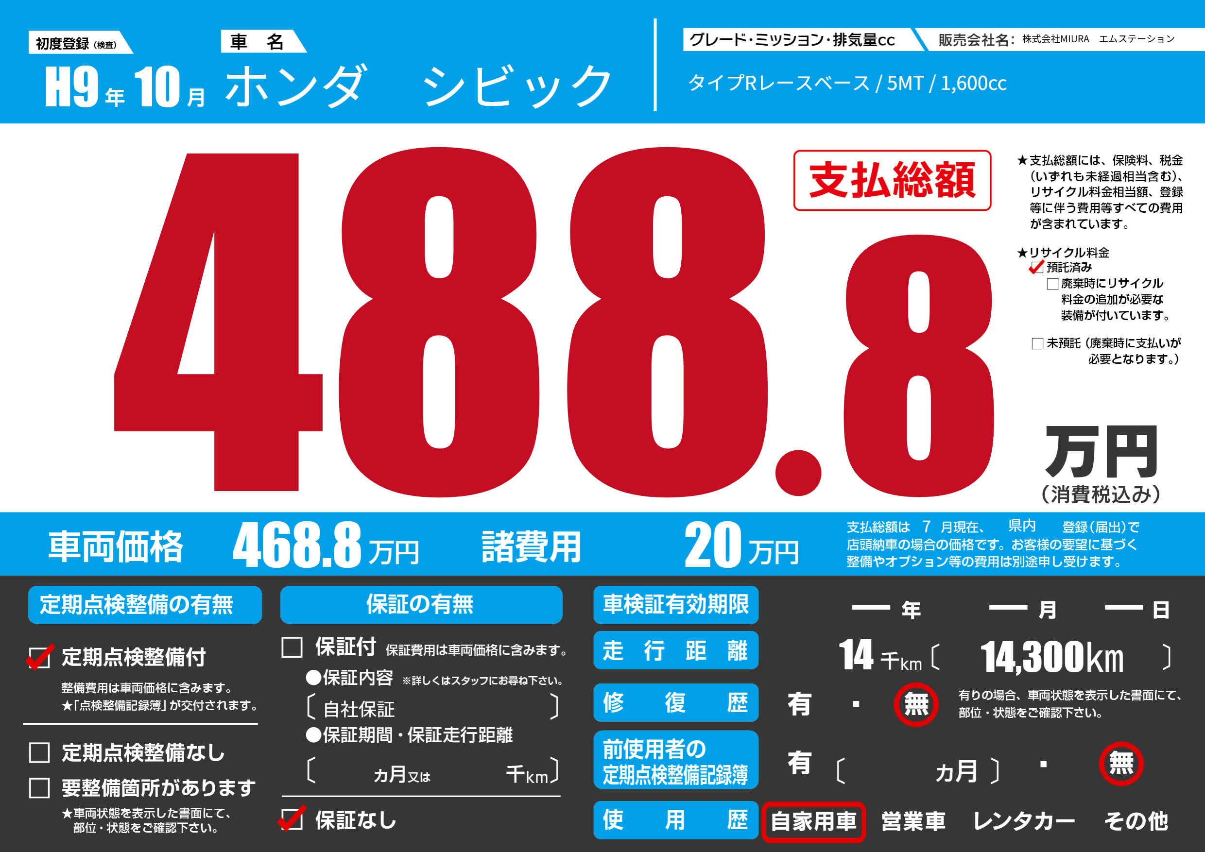 | 走行キロ | 1.4万km | 初年度登録 | H9年10月 |