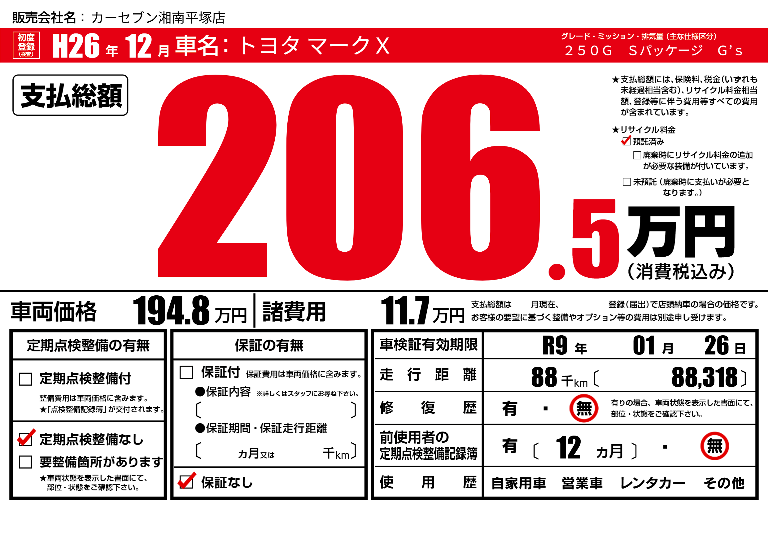 | 走行キロ | 8.8万km | 初年度登録 | H26年12月 |