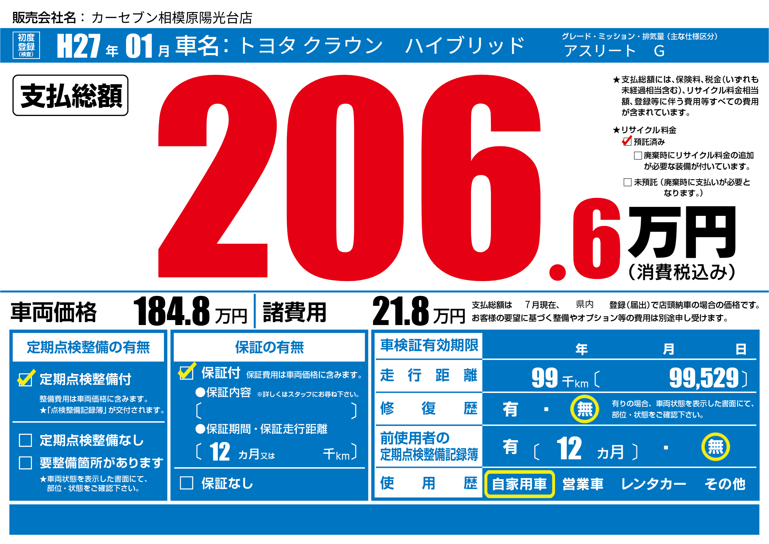 | 車名 | トヨタ クラウン ハイブリッド | グレード ミッション 排気量 |