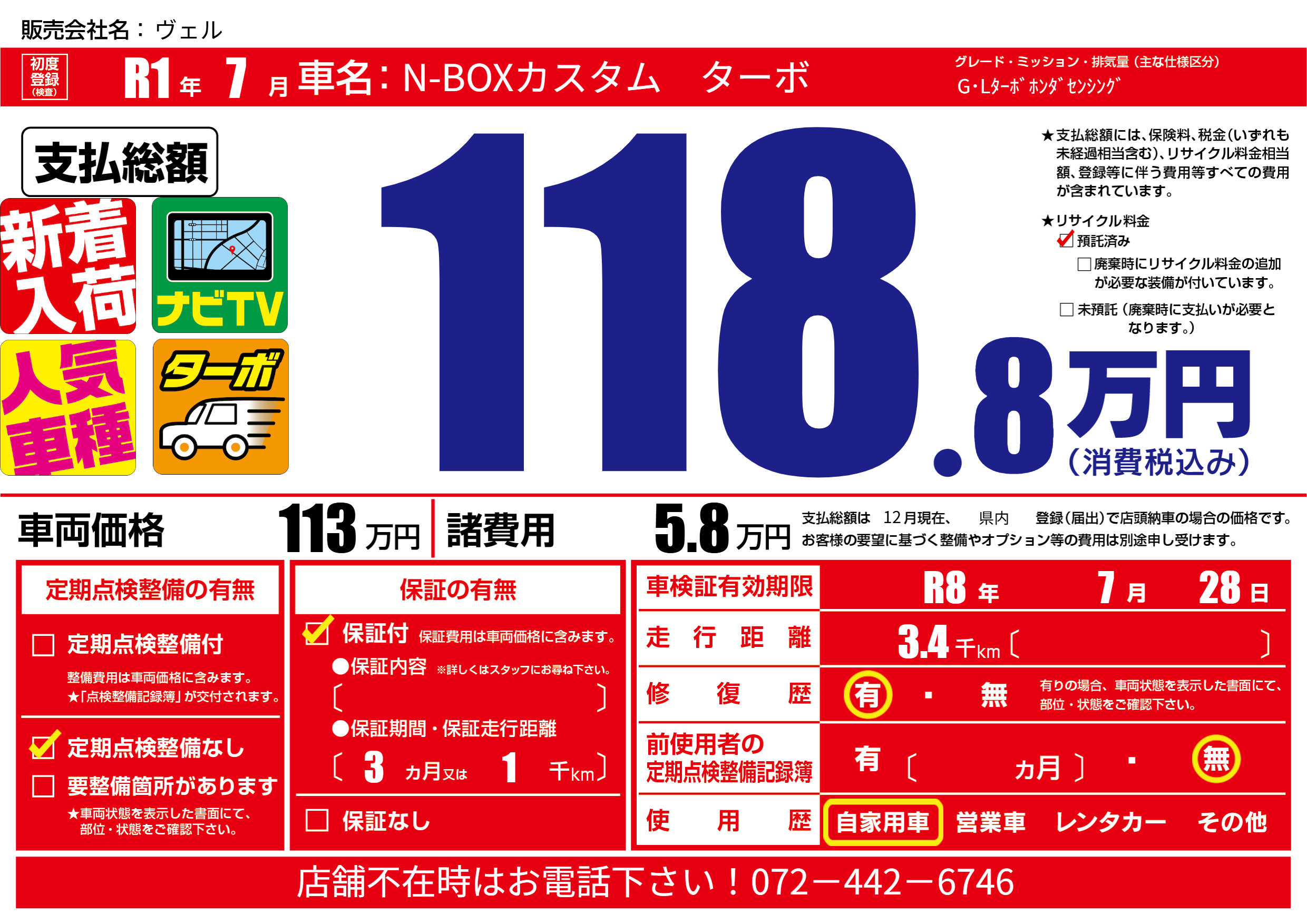 | 車名 | N-BOXカスタム ターボ | グレード ミッション 排気量 |
