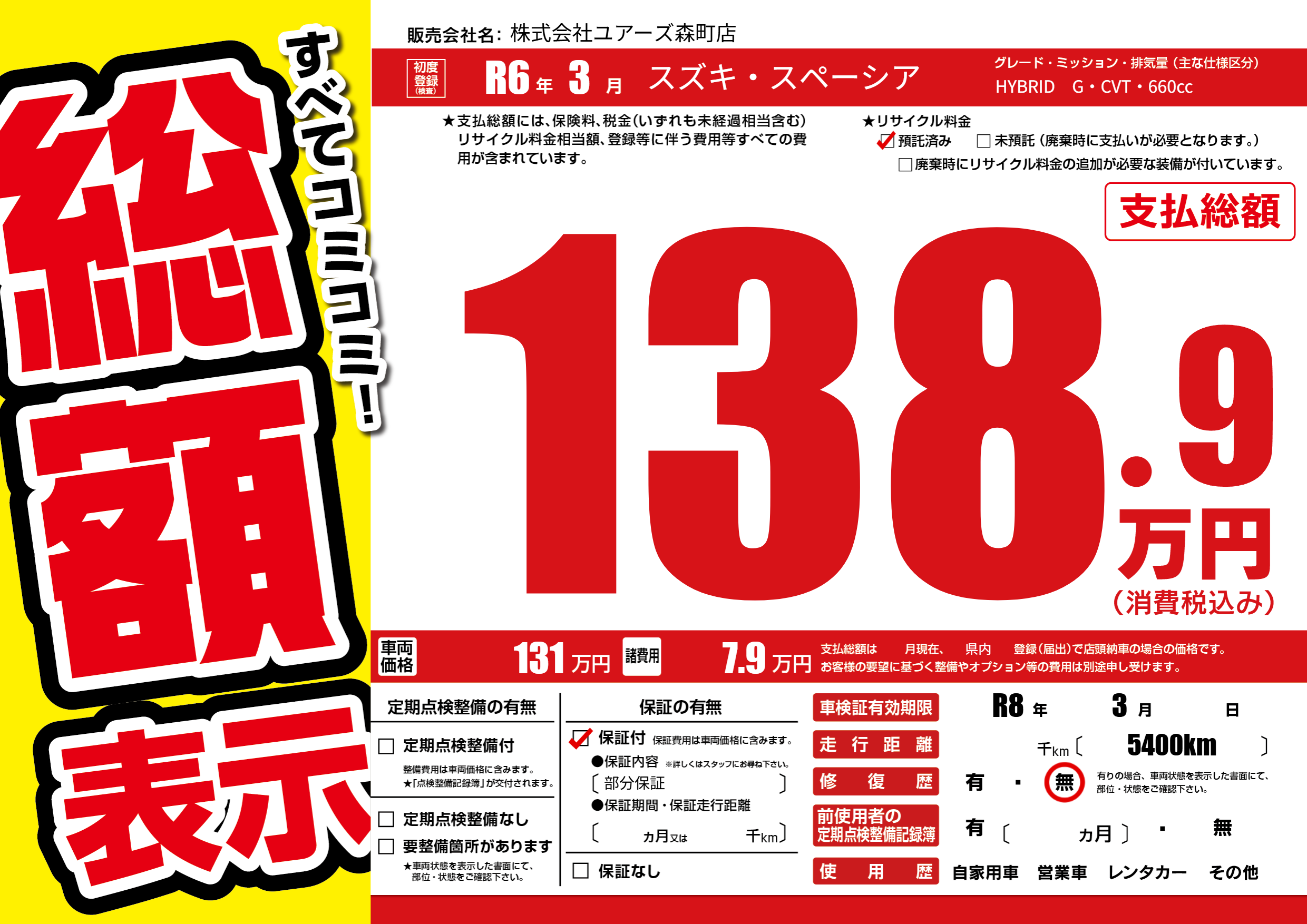 | 車名 | スズキ・スペーシア | グレード ミッション 排気量 |