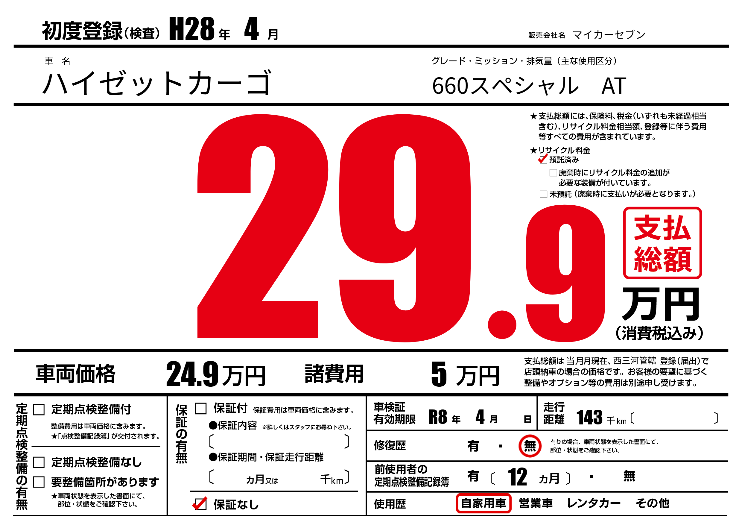 | 車名 | ハイゼットカーゴ | グレード ミッション 排気量 |