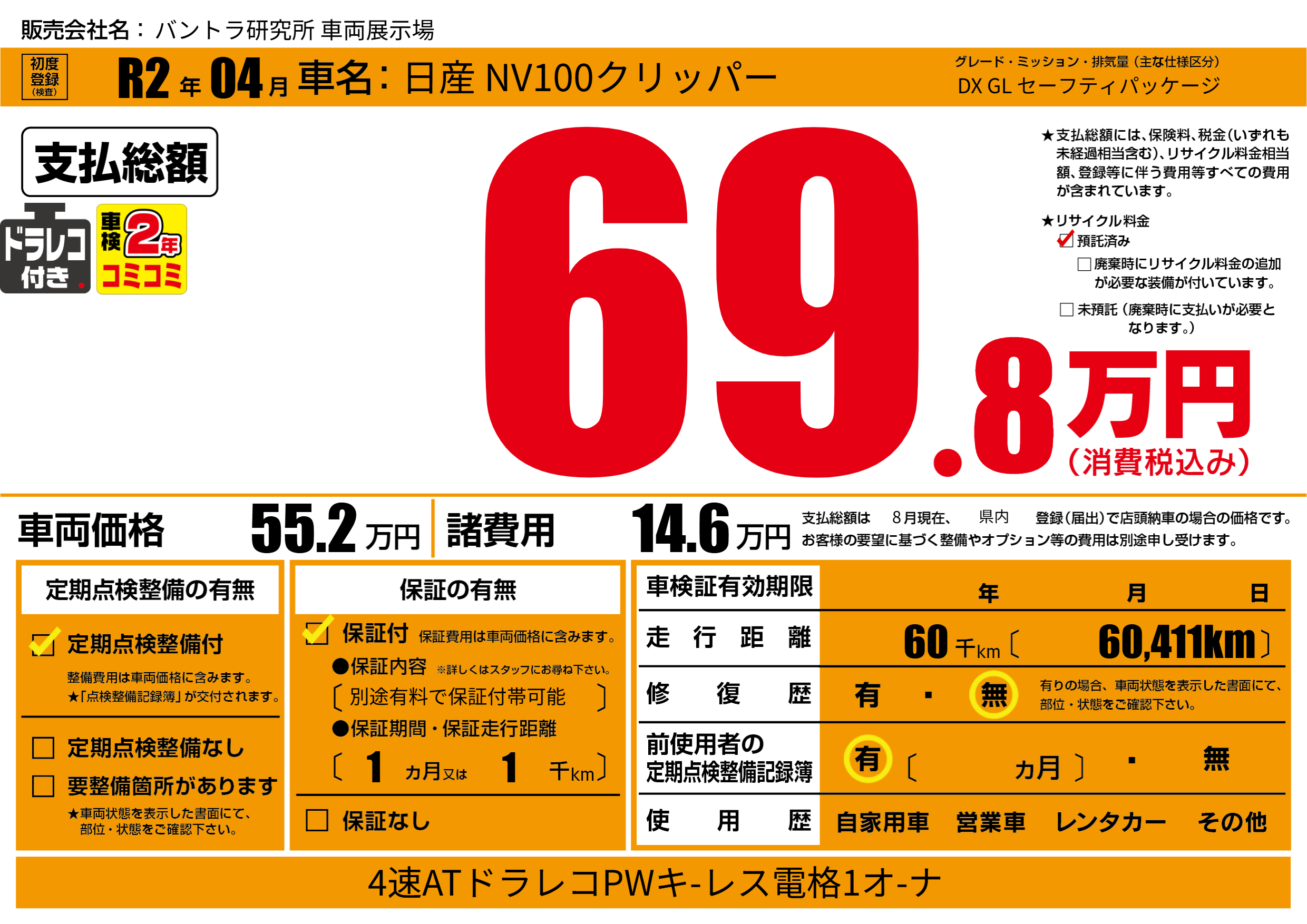 | 車名 | 日産 NV100クリッパー | グレード ミッション 排気量 |