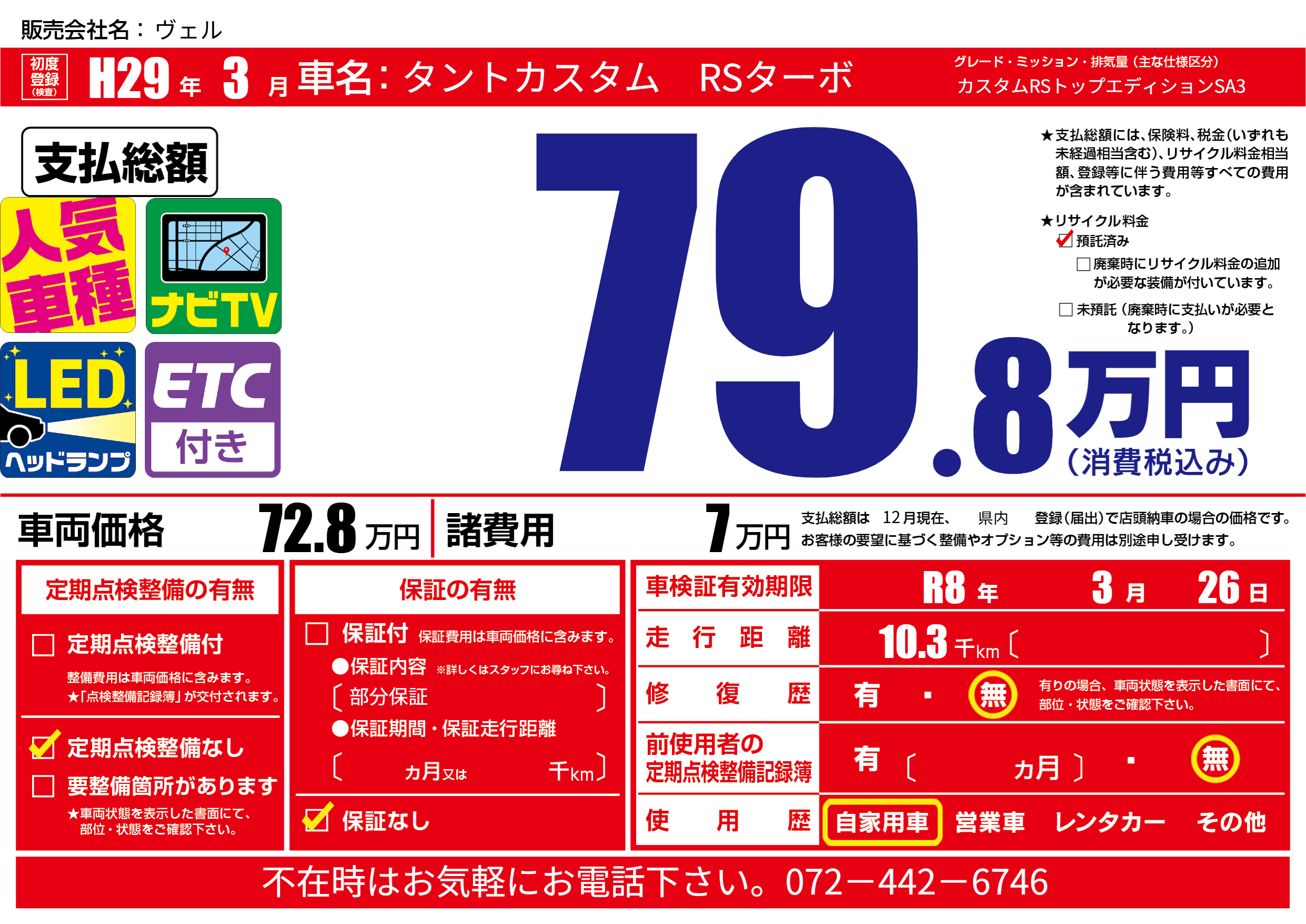 | 車名 | タントカスタム RSターボ | グレード ミッション 排気量 |