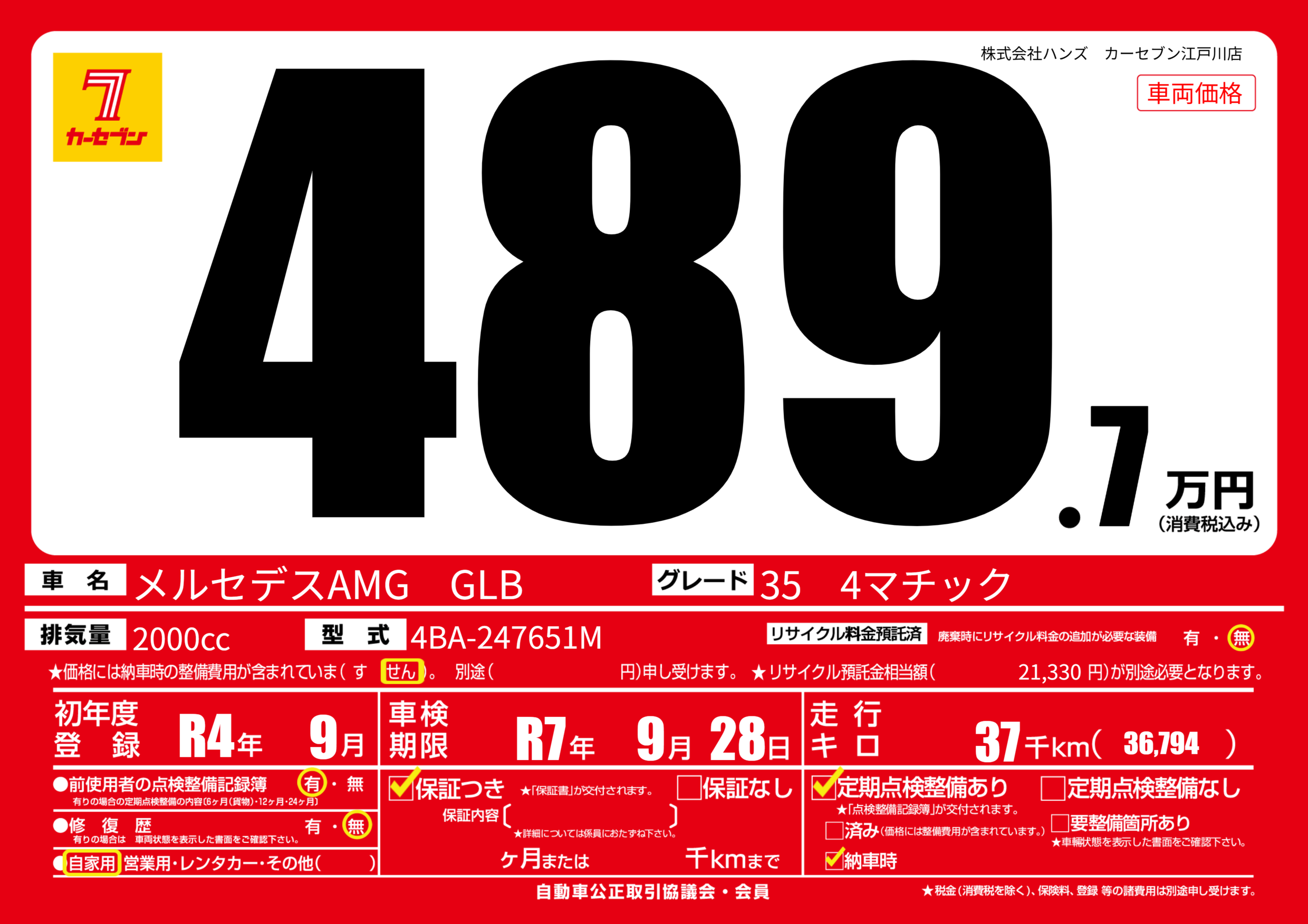 | 走行キロ | 3.7万km | 初年度登録 | R4年9月 |