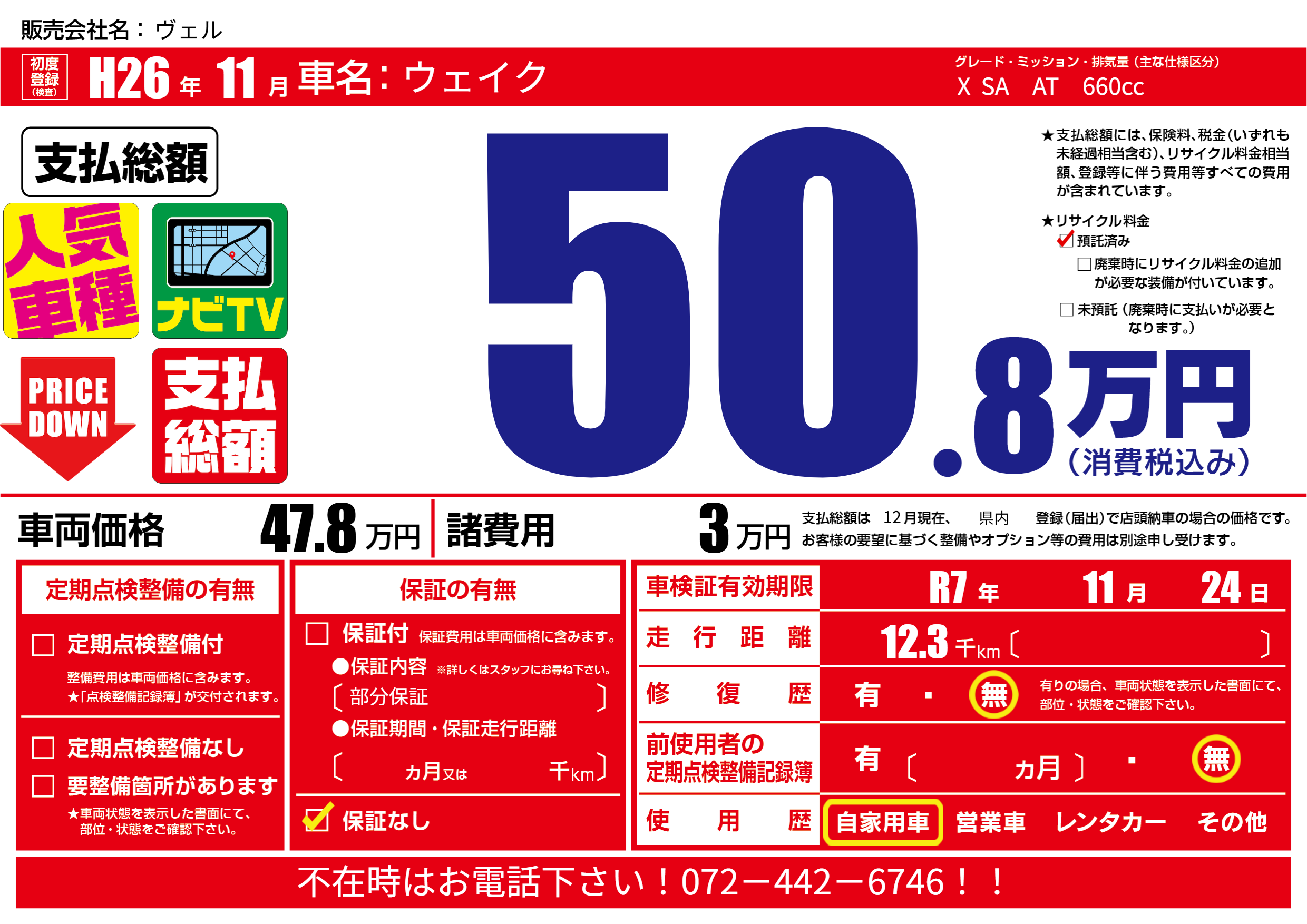 | 走行キロ | 1.2万km | 初年度登録 | H26年11月 |