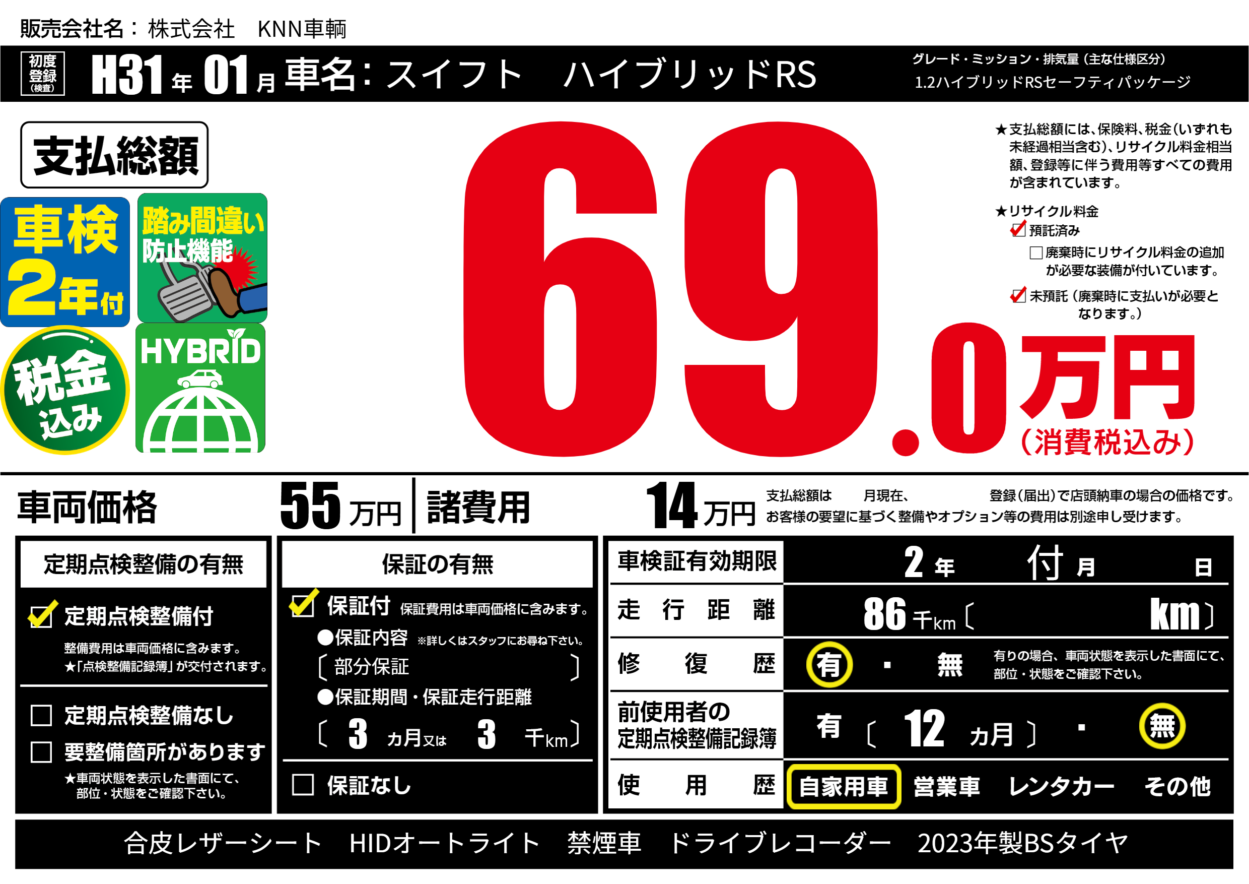 | 車名 | スイフト ハイブリッドRS | グレード ミッション 排気量 |
