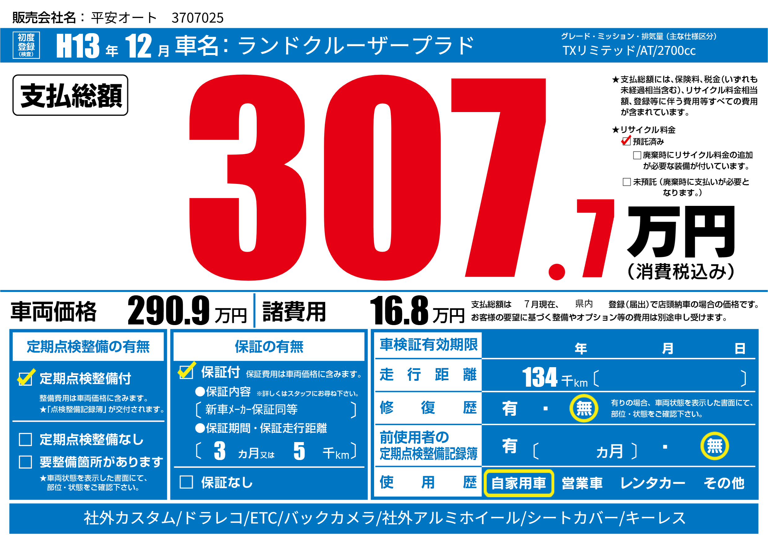 | 走行キロ | 13.4万km | 初年度登録 | H13年12月 |