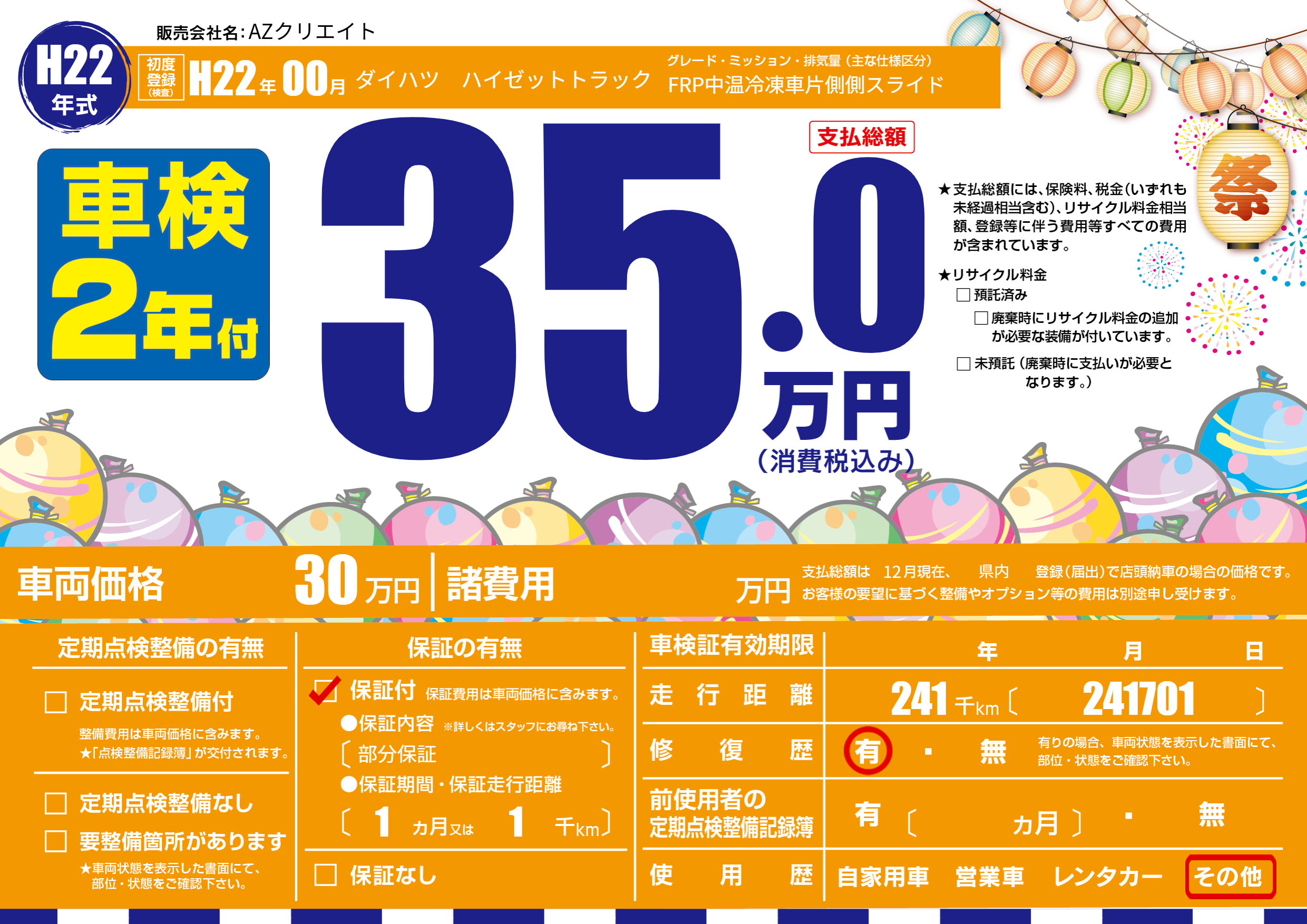| 走行キロ | 24.1万km | 初年度登録 | H22年00月 |