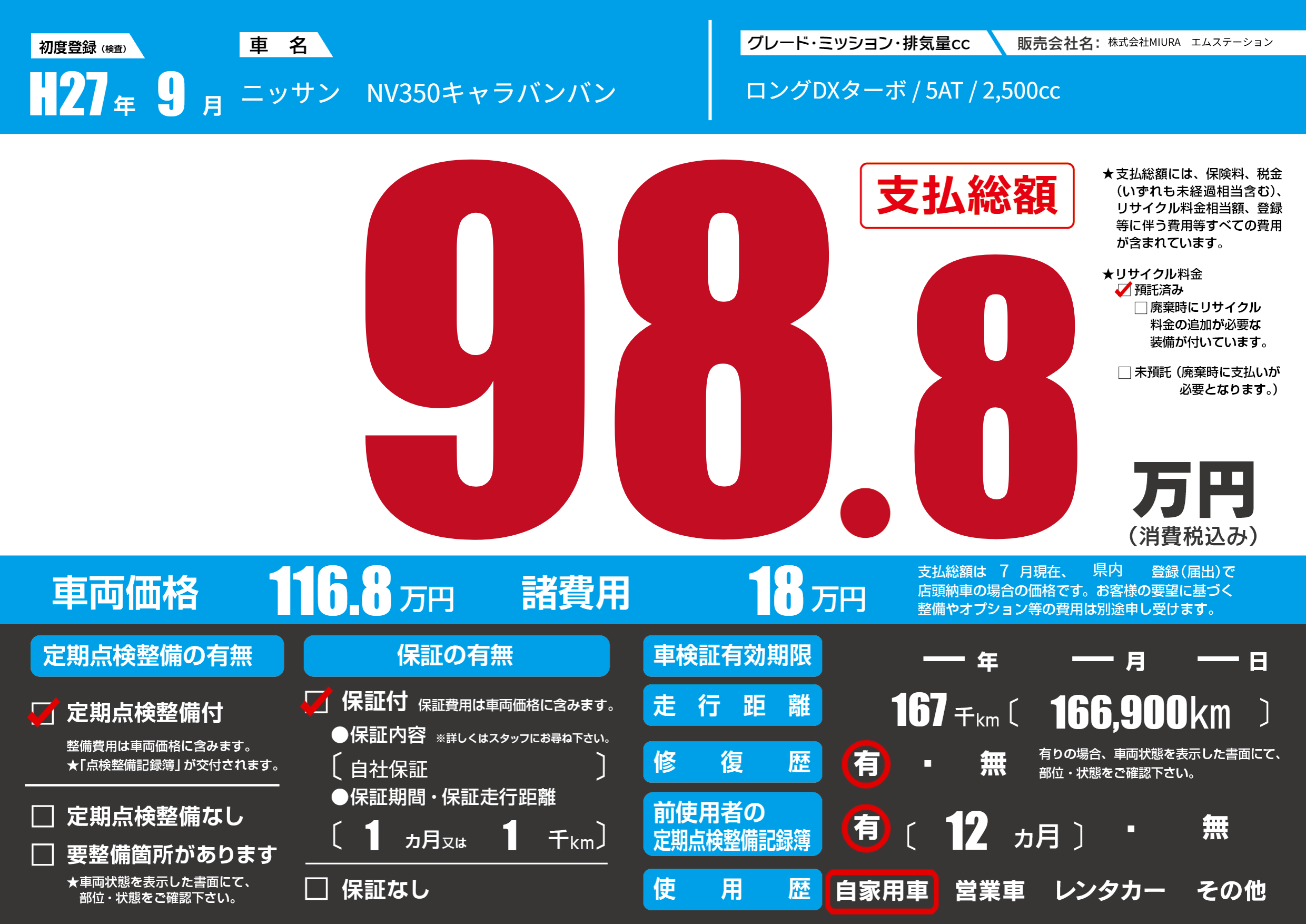 | 走行キロ | 16.7万km | 初年度登録 | H27年9月 |