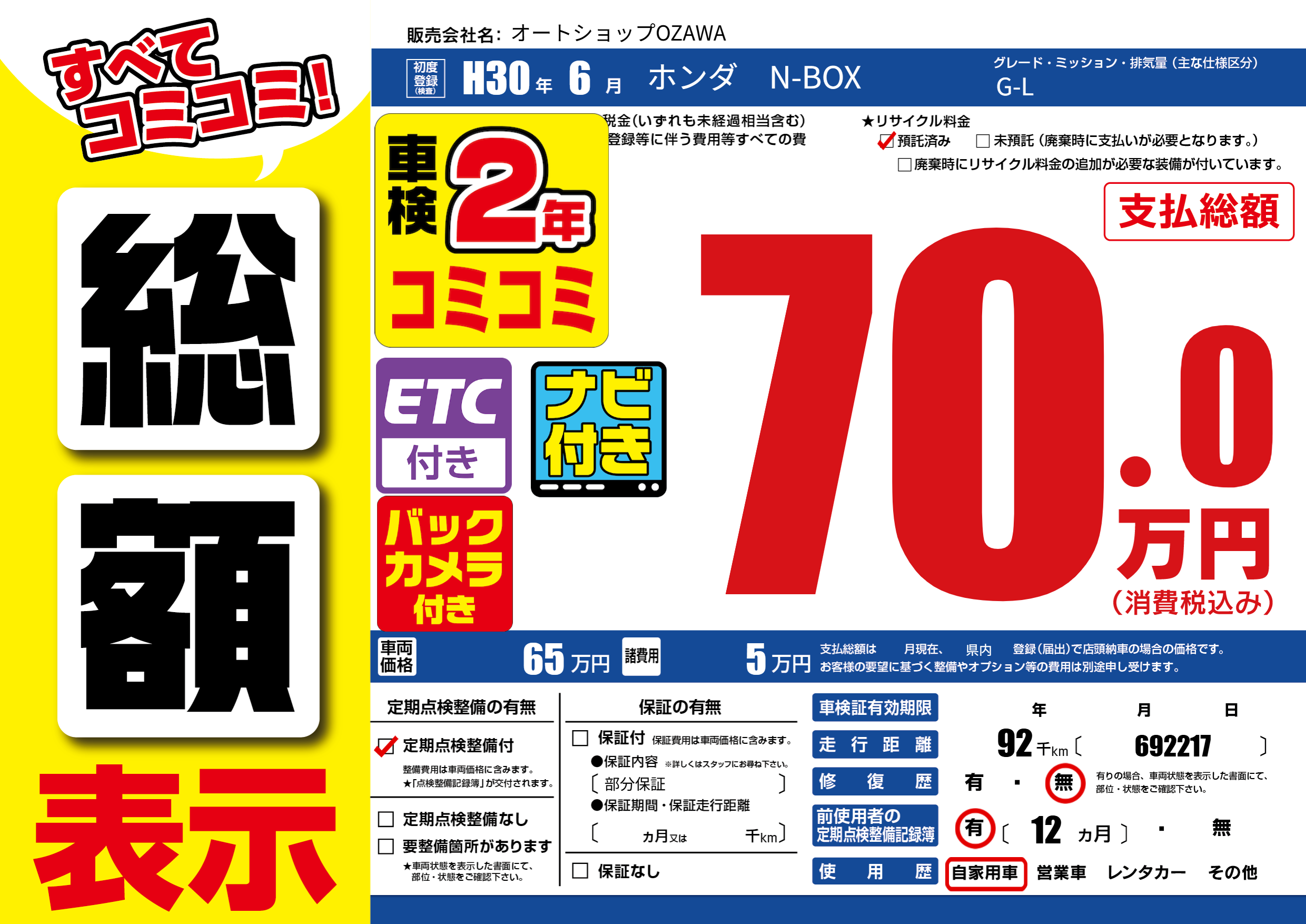 | 車名 | ホンダ N-BOX | グレード ミッション 排気量 |