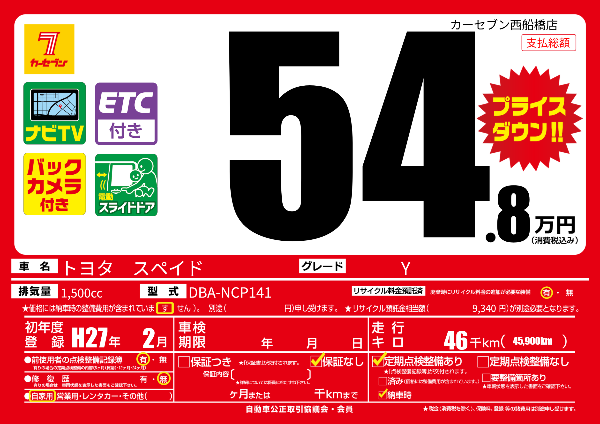| 車名 | トヨタ スペイド | グレード ミッション 排気量 |