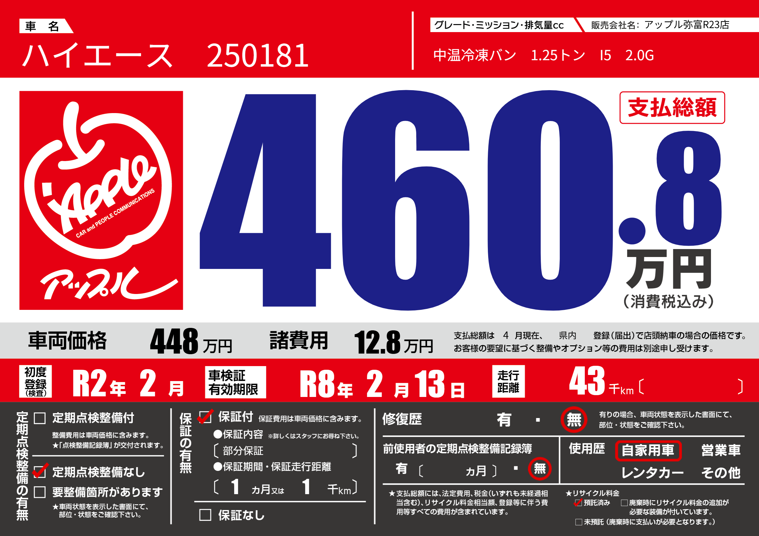 | 車名 | ハイエース 250181 | グレード ミッション 排気量 |