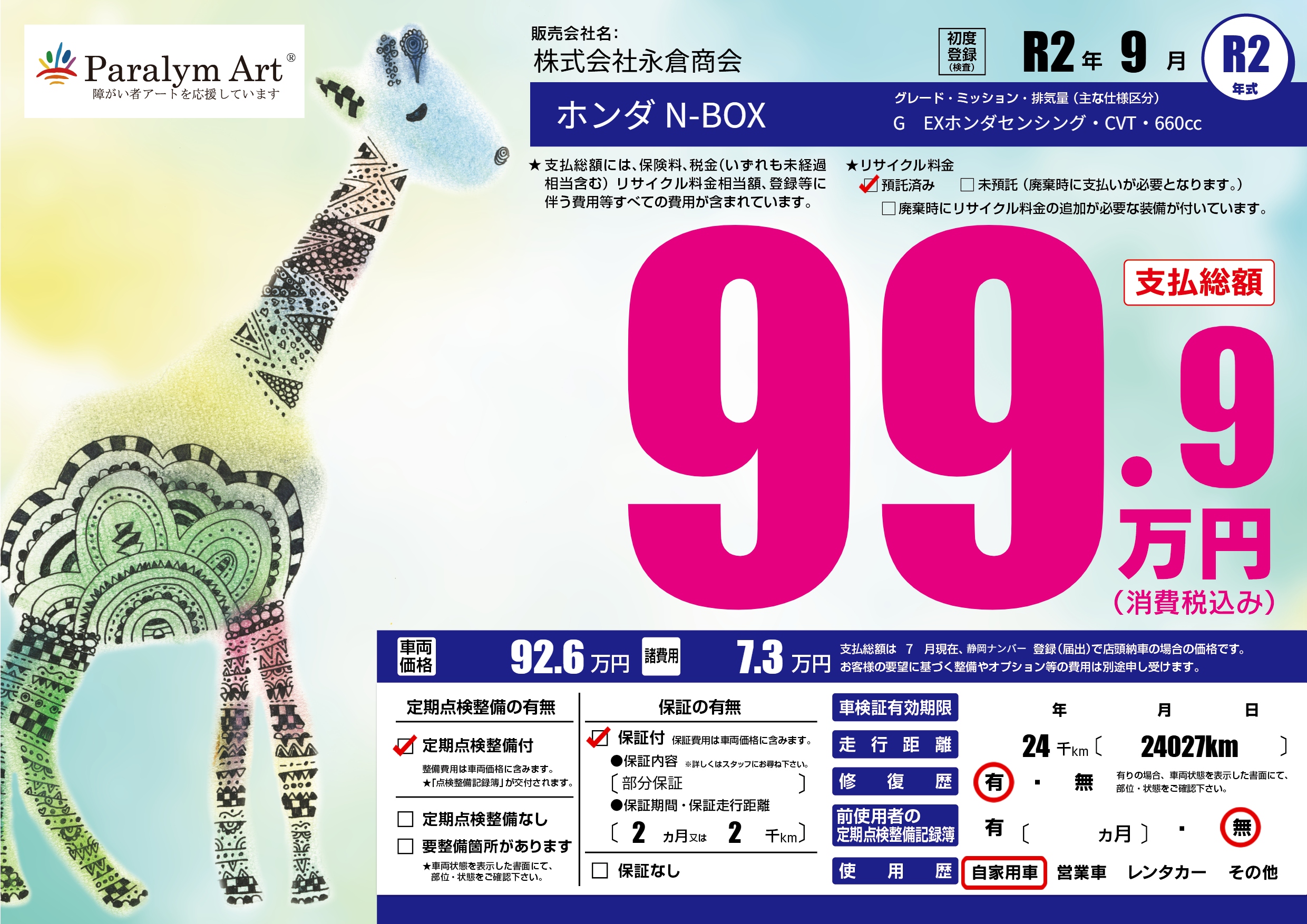 | 走行キロ | 2.4万km | 初年度登録 | R2年9月 |