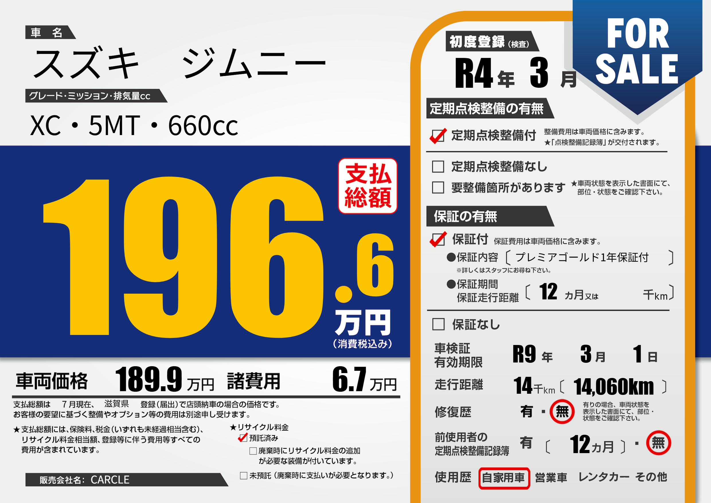 | 車名 | スズキ ジムニー | グレード ミッション 排気量 |
