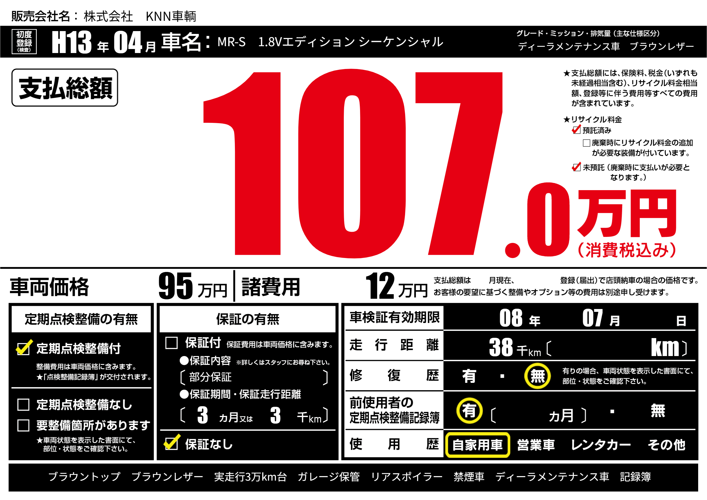 | 車名 | MR-S 1.8Vエディション シーケンシャル | グレード ミッション 排気量 |