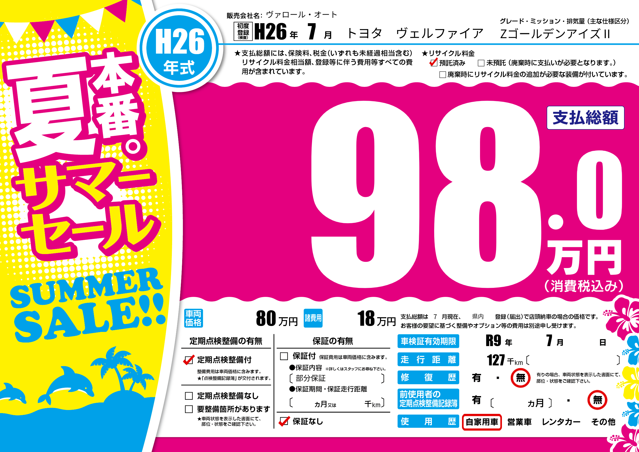 | 走行キロ | 12.7万km | 初年度登録 | H26年7月 |