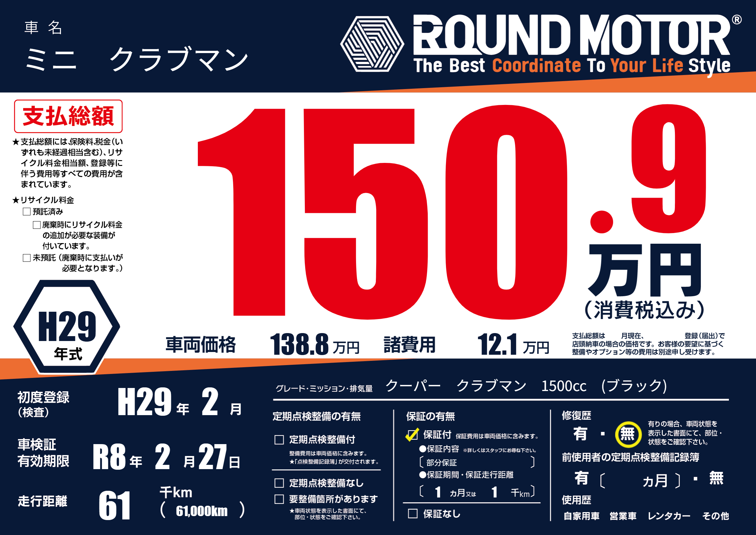 | 走行キロ | 6.1万km | 初年度登録 | H29年2月 |