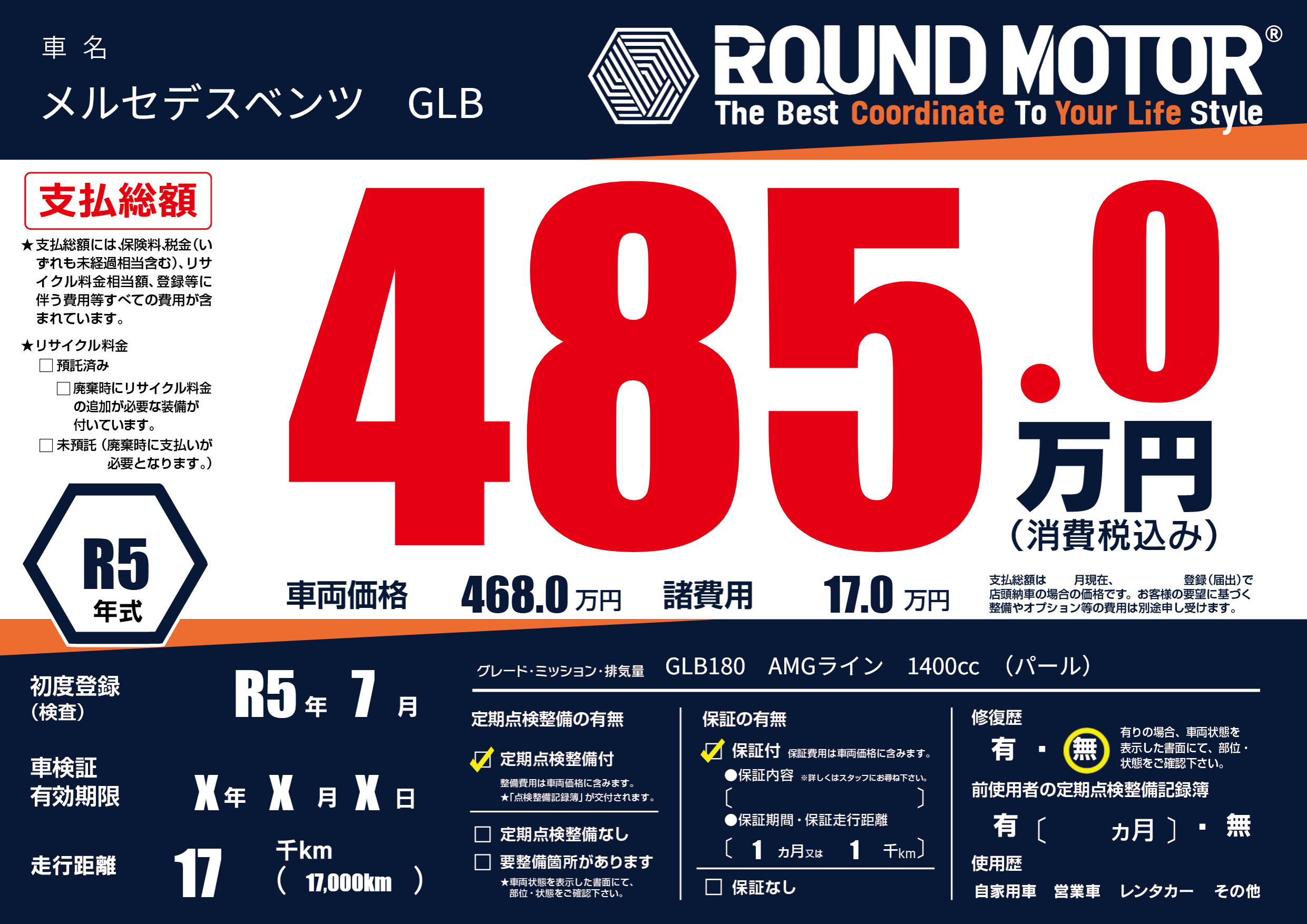 | 車名 | メルセデスベンツ GLB | グレード ミッション 排気量 |
