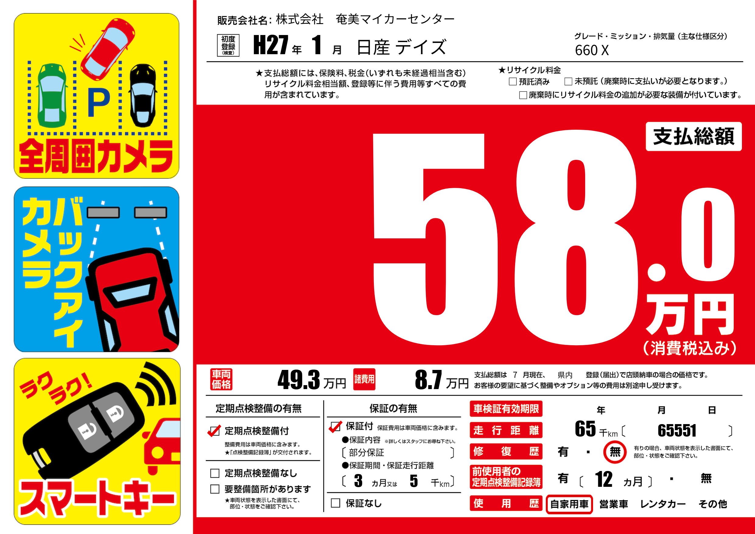 | 走行キロ | 6.5万km | 初年度登録 | H27年1月 |