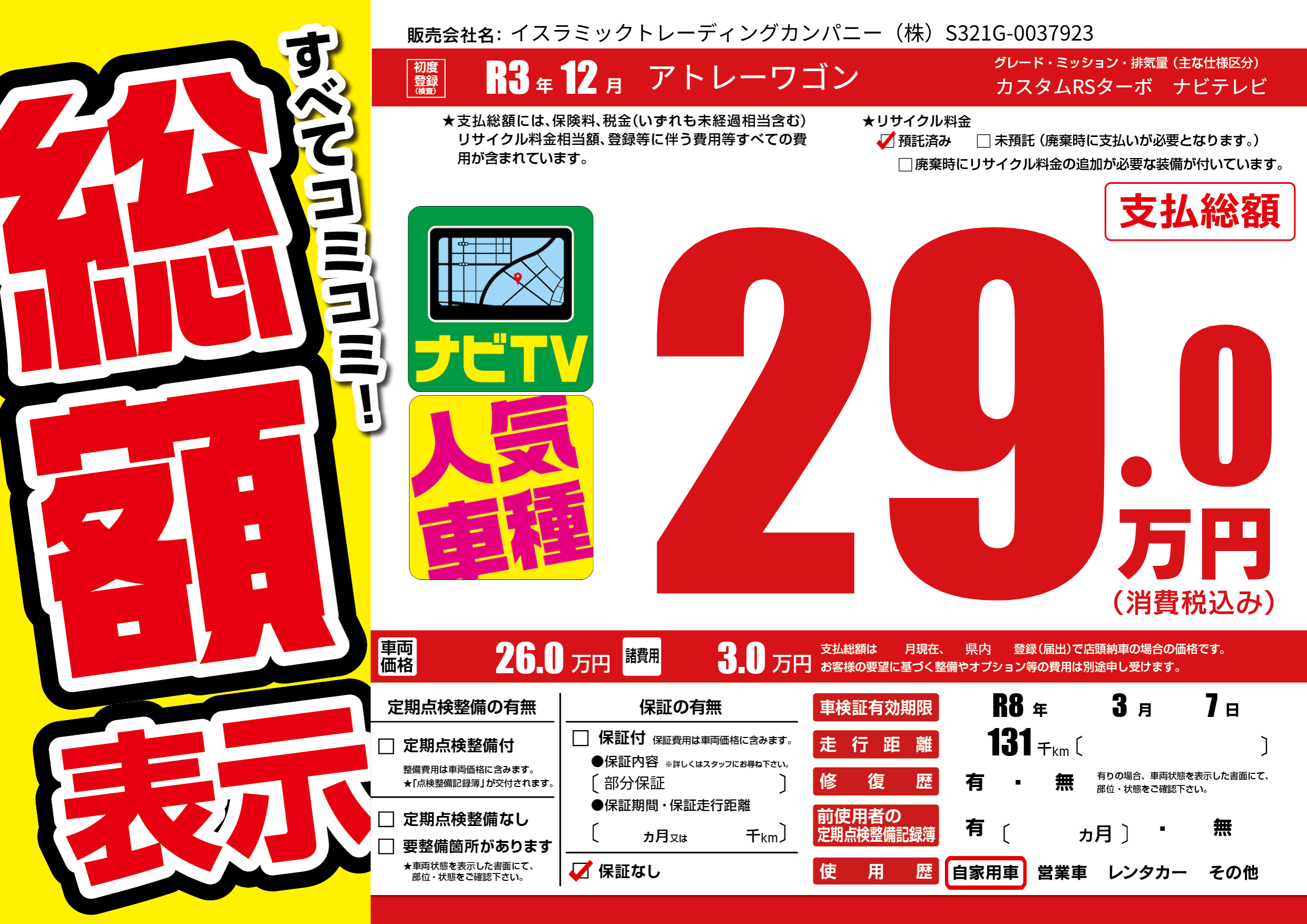 | 走行キロ | 13.1万km | 初年度登録 | R3年12月 |