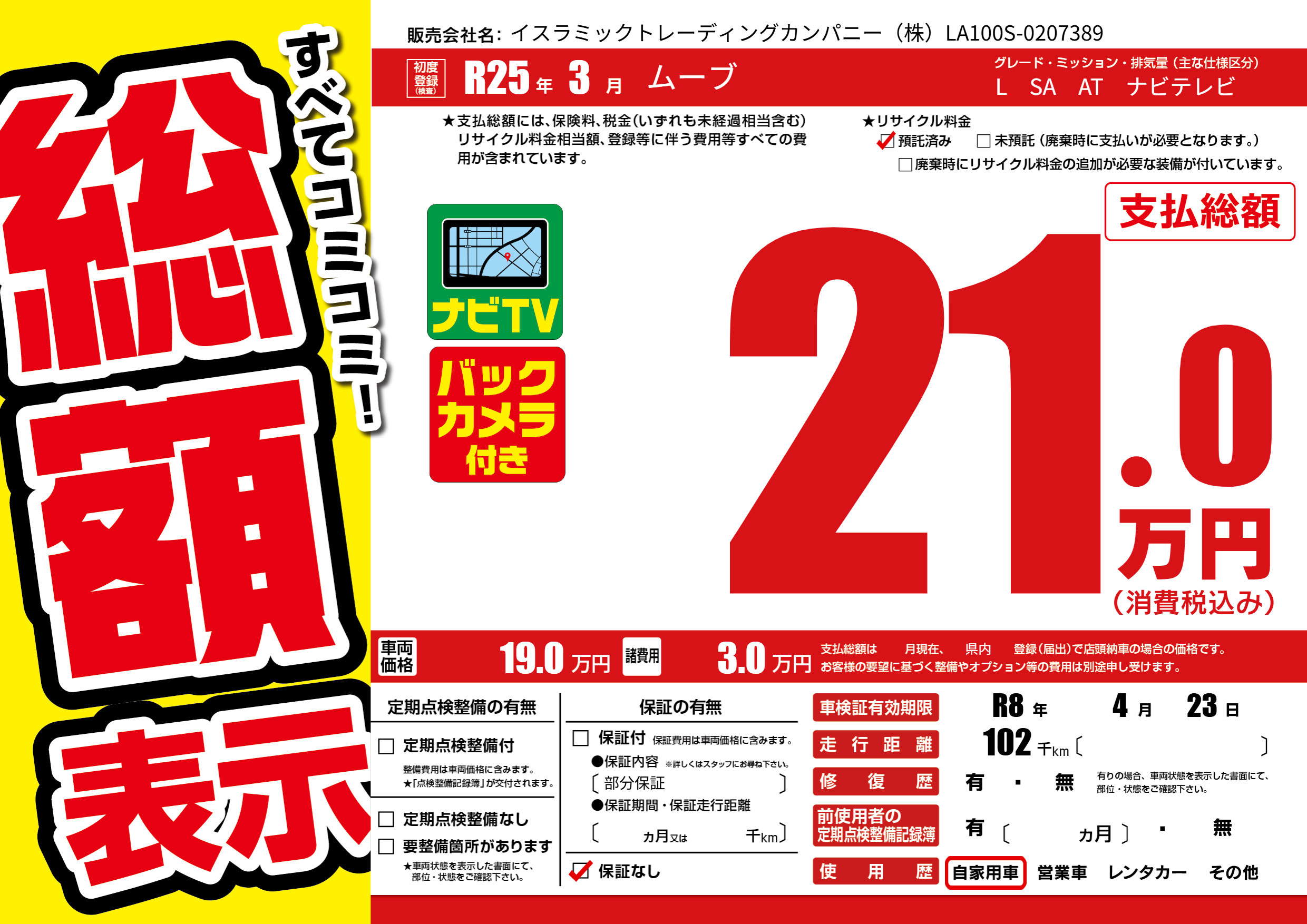 | 走行キロ | 10.2万km | 初年度登録 | R25年3月 |