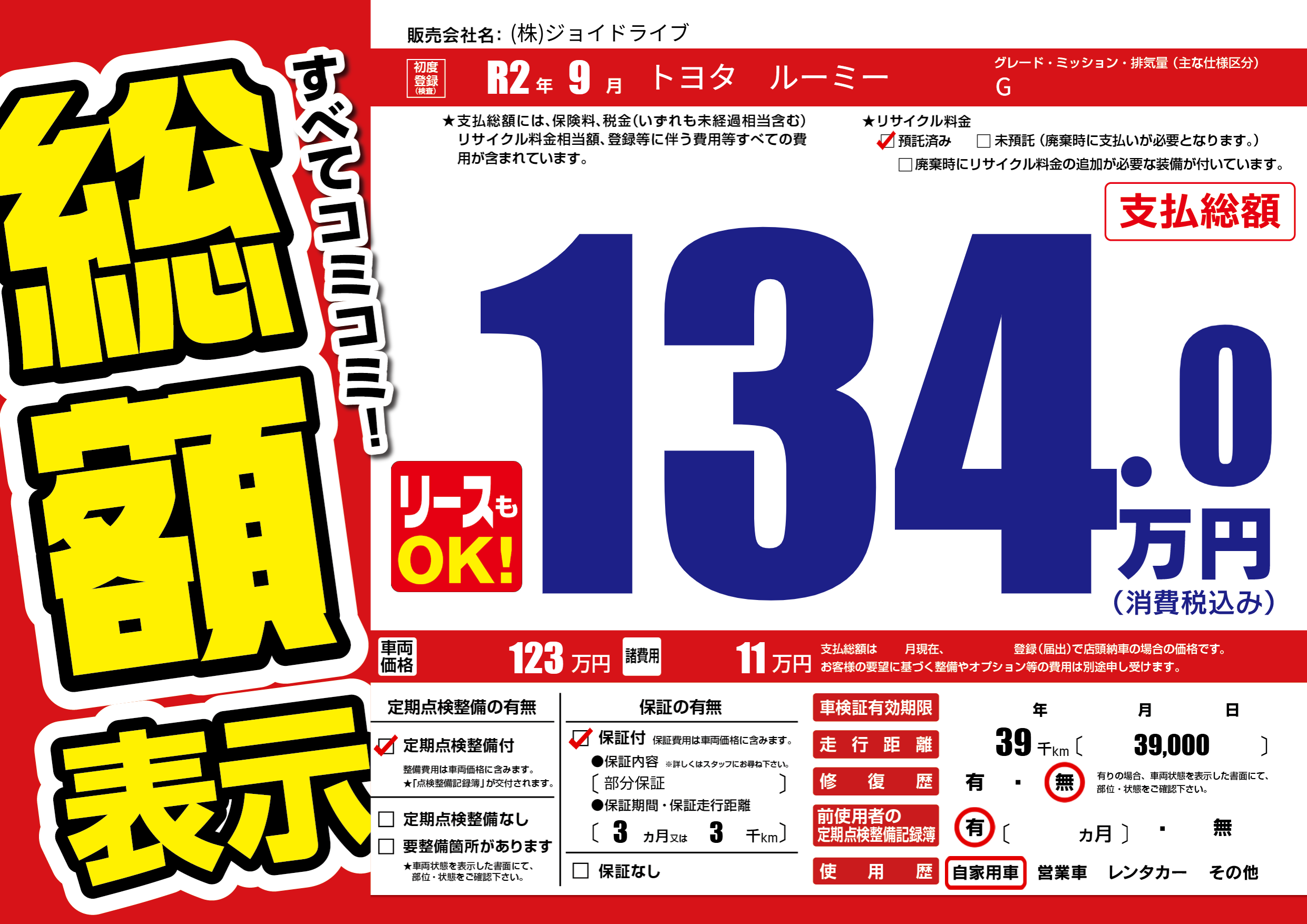 | 車名 | トヨタ ルーミー | グレード ミッション 排気量 |