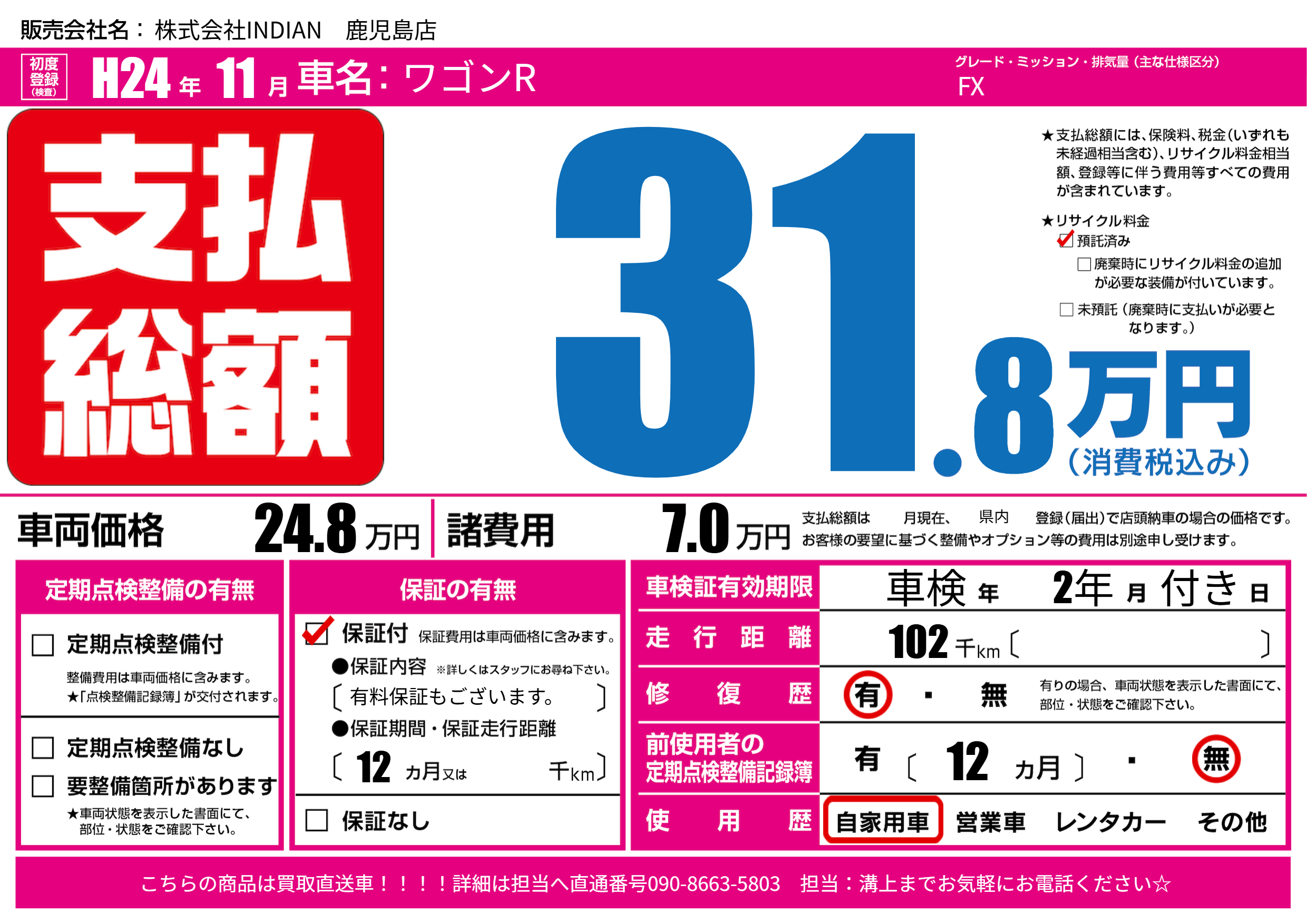 | 走行キロ | 10.2万km | 初年度登録 | H24年11月 |