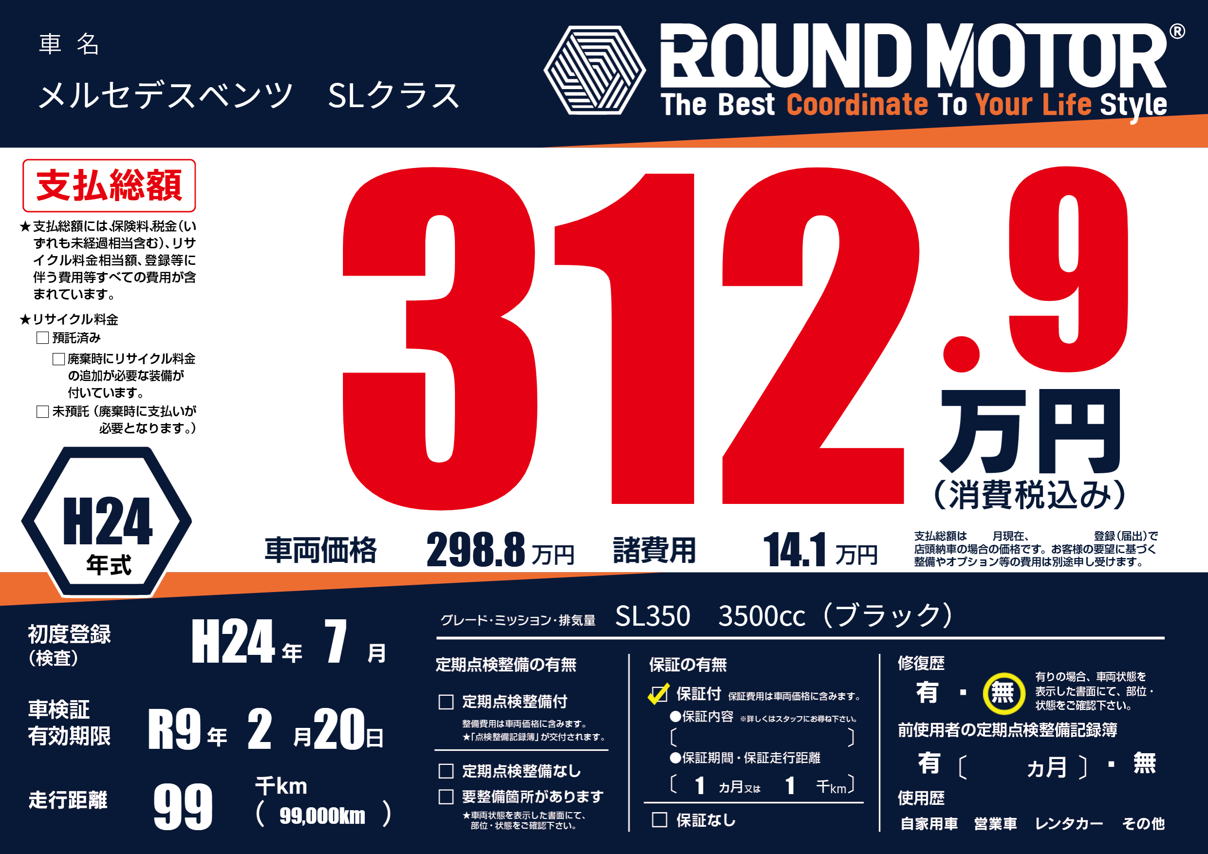 | 車名 | メルセデスベンツ SLクラス | グレード ミッション 排気量 |