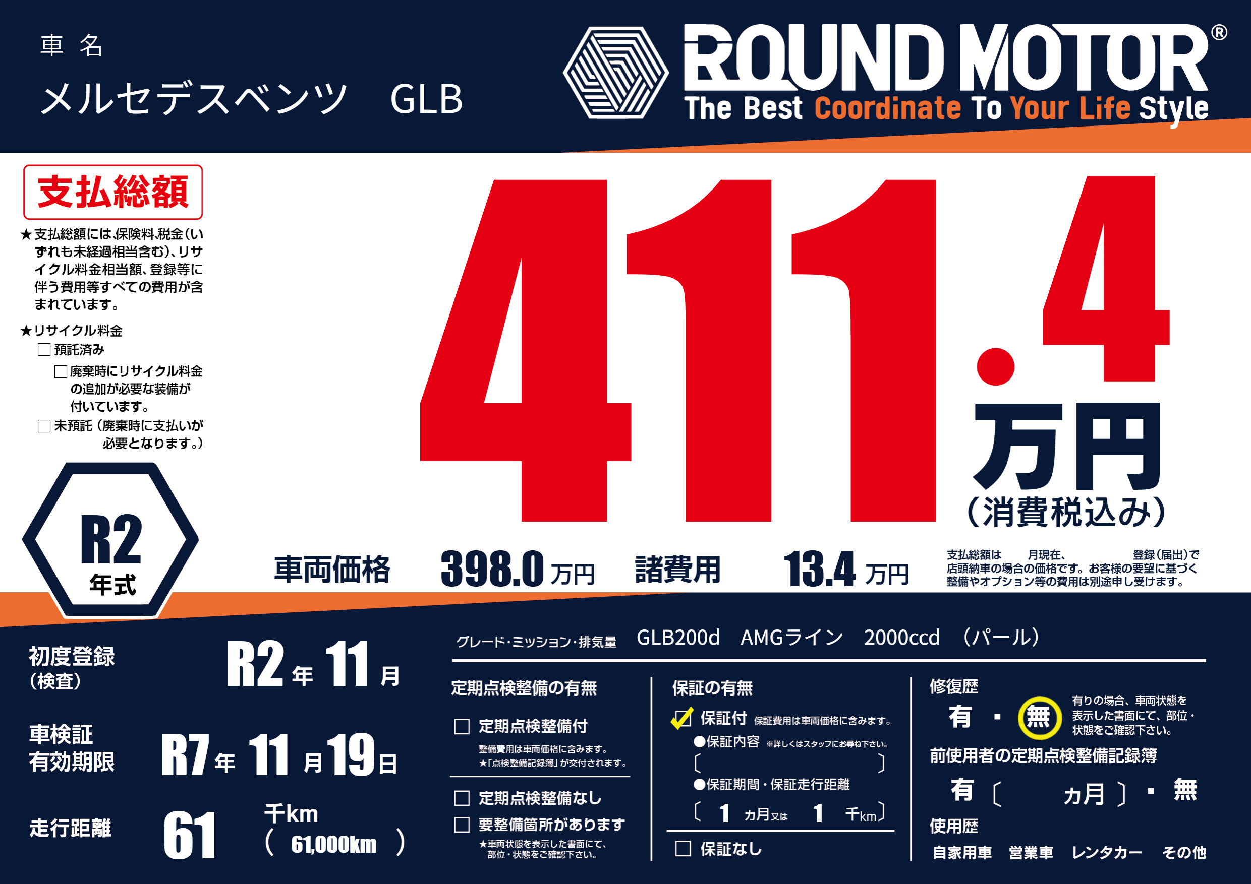 | 車名 | メルセデスベンツ GLB | グレード ミッション 排気量 |