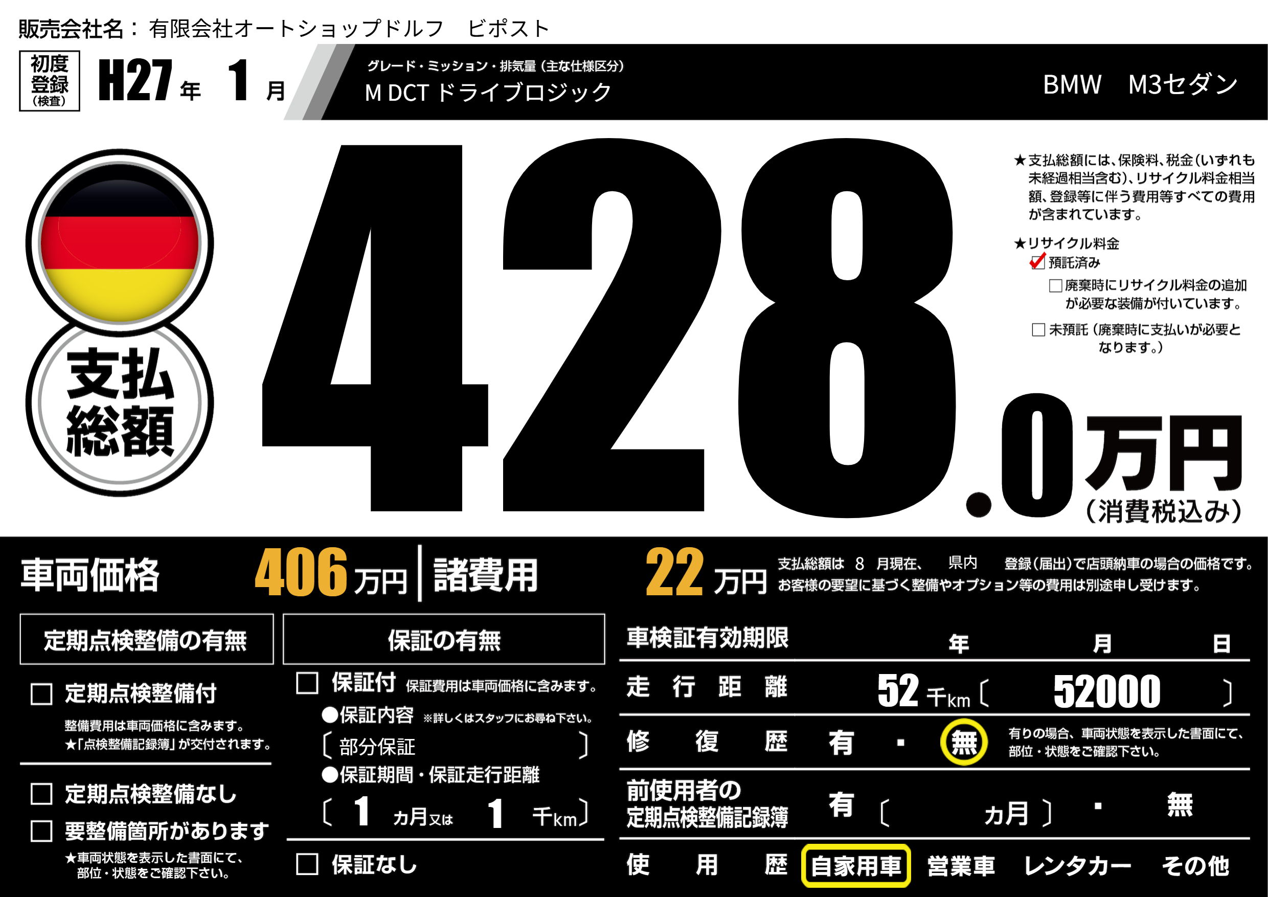 | 車名 | BMW M3セダン | グレード ミッション 排気量 |