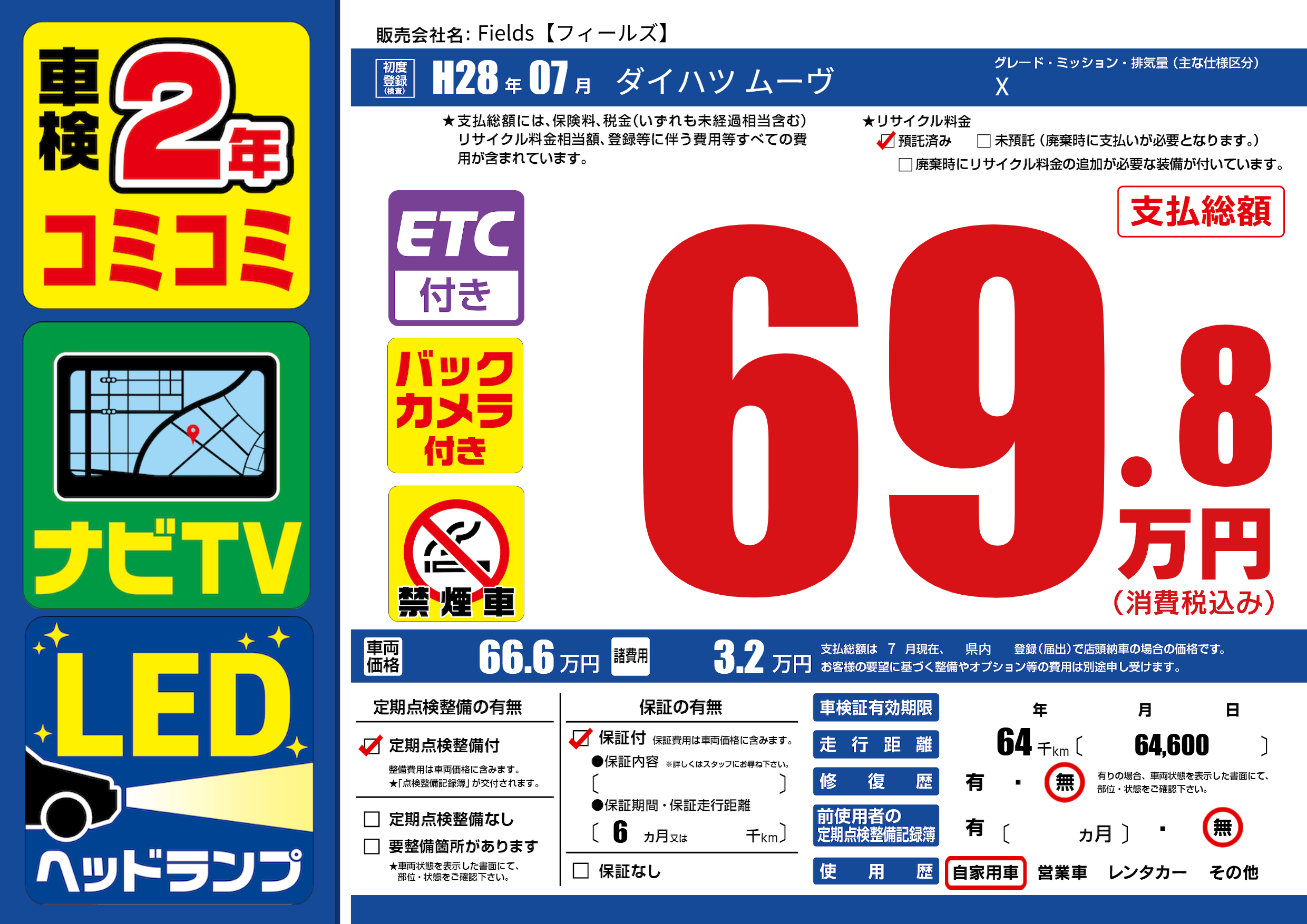 | 走行キロ | 6.4万km | 初年度登録 | H28年07月 |