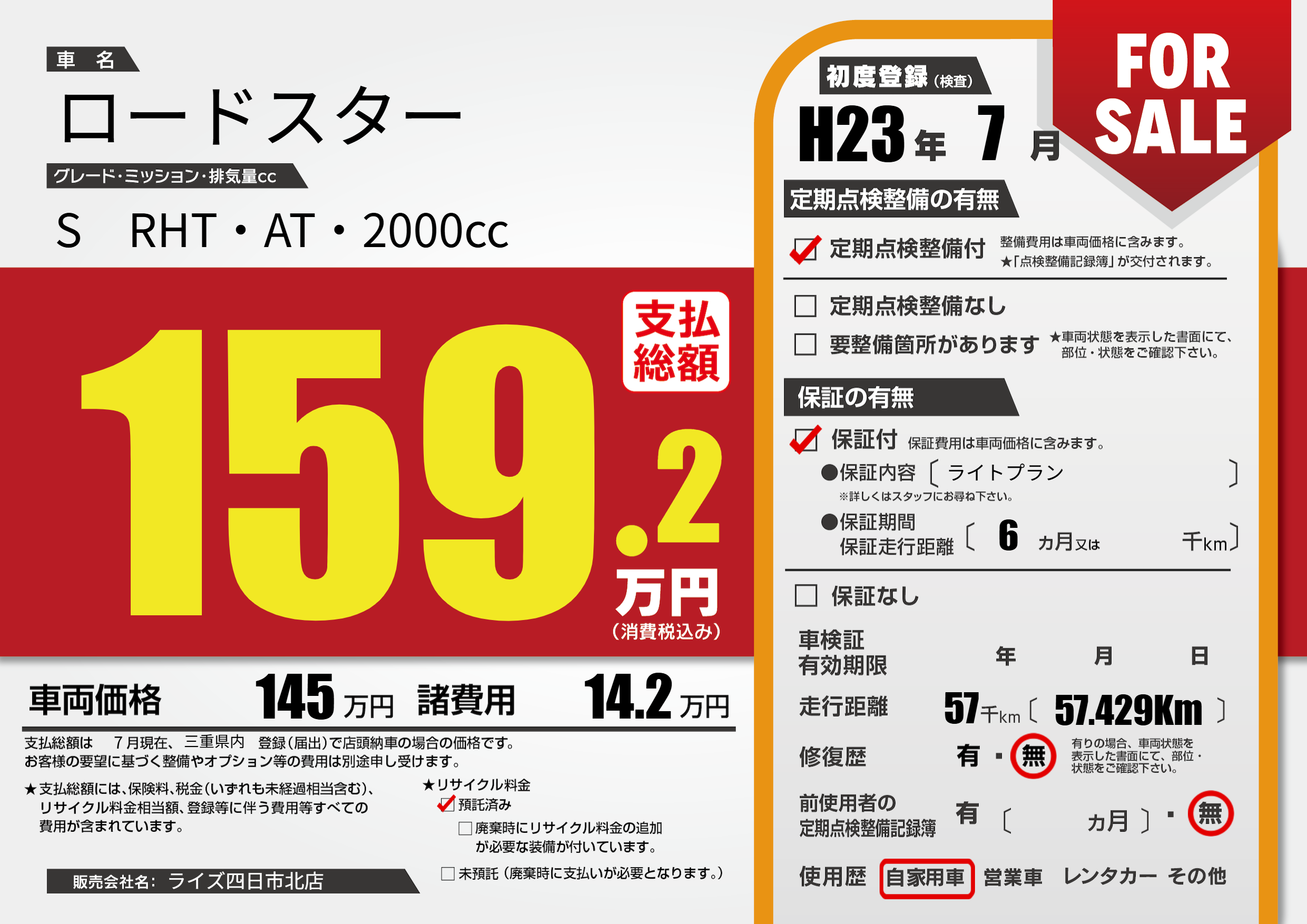 | 車名 | ロードスター | グレード ミッション 排気量 |