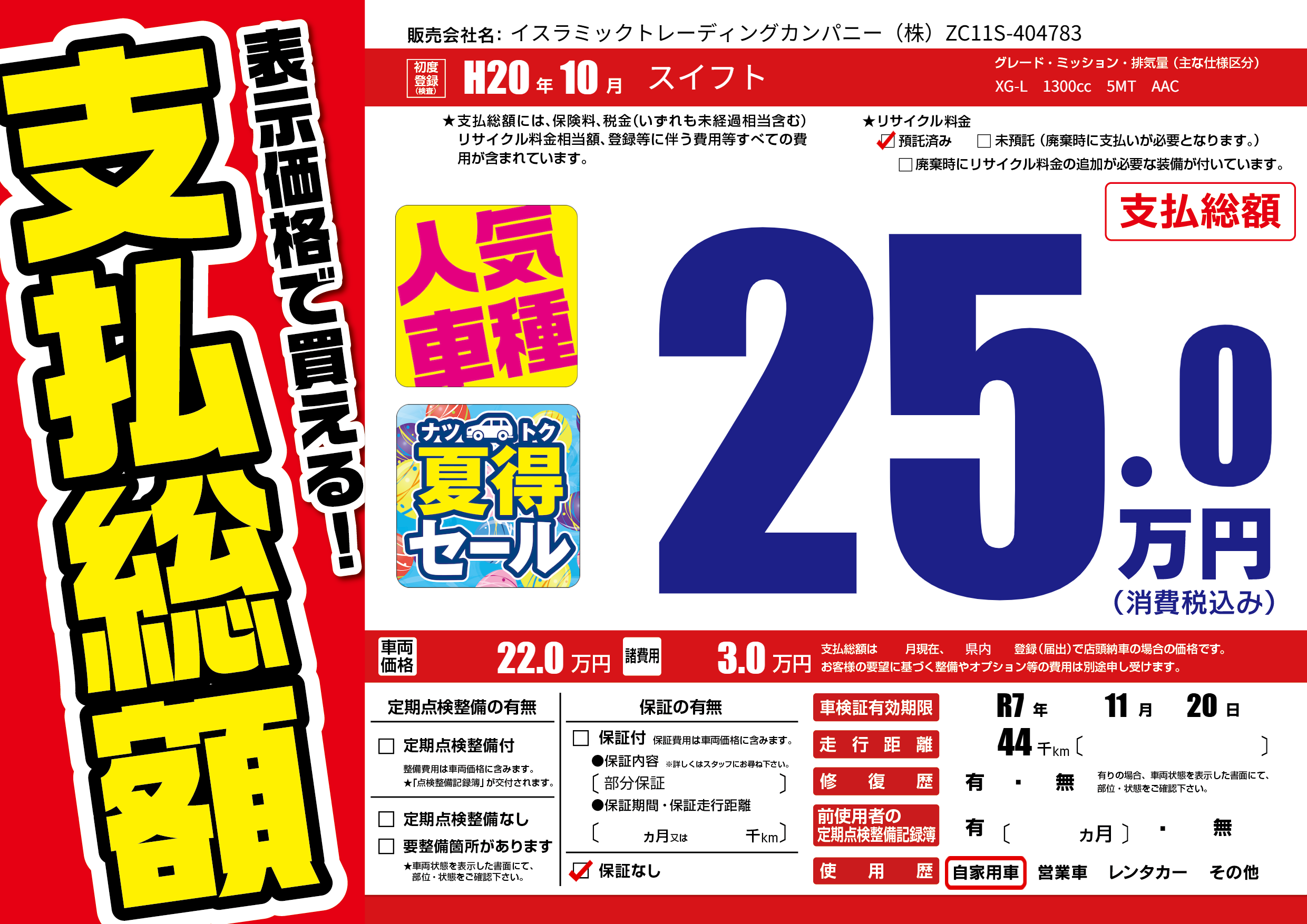 | 走行キロ | 4.4万km | 初年度登録 | H20年10月 |