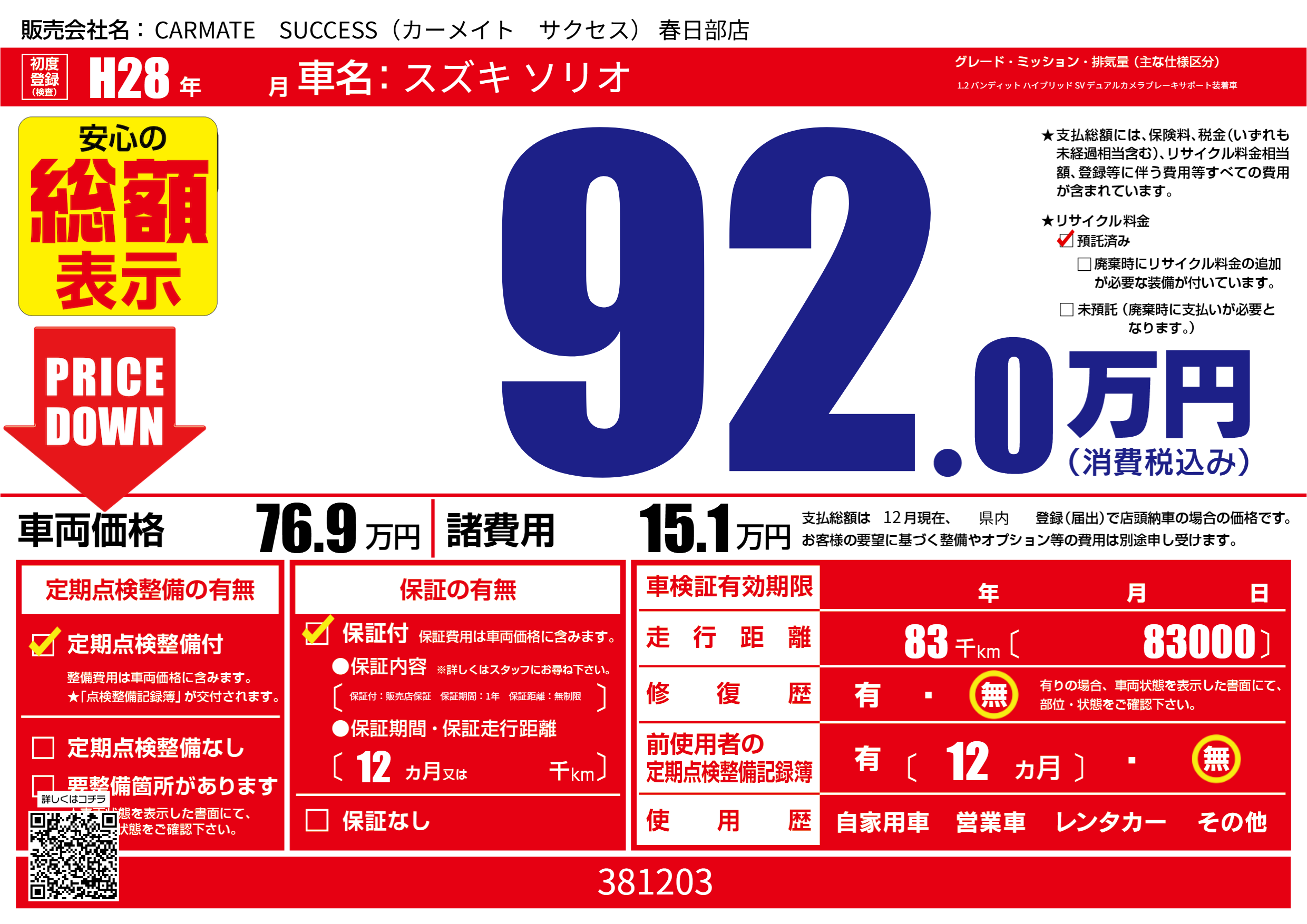| 車名 | スズキ ソリオ | グレード ミッション 排気量 |