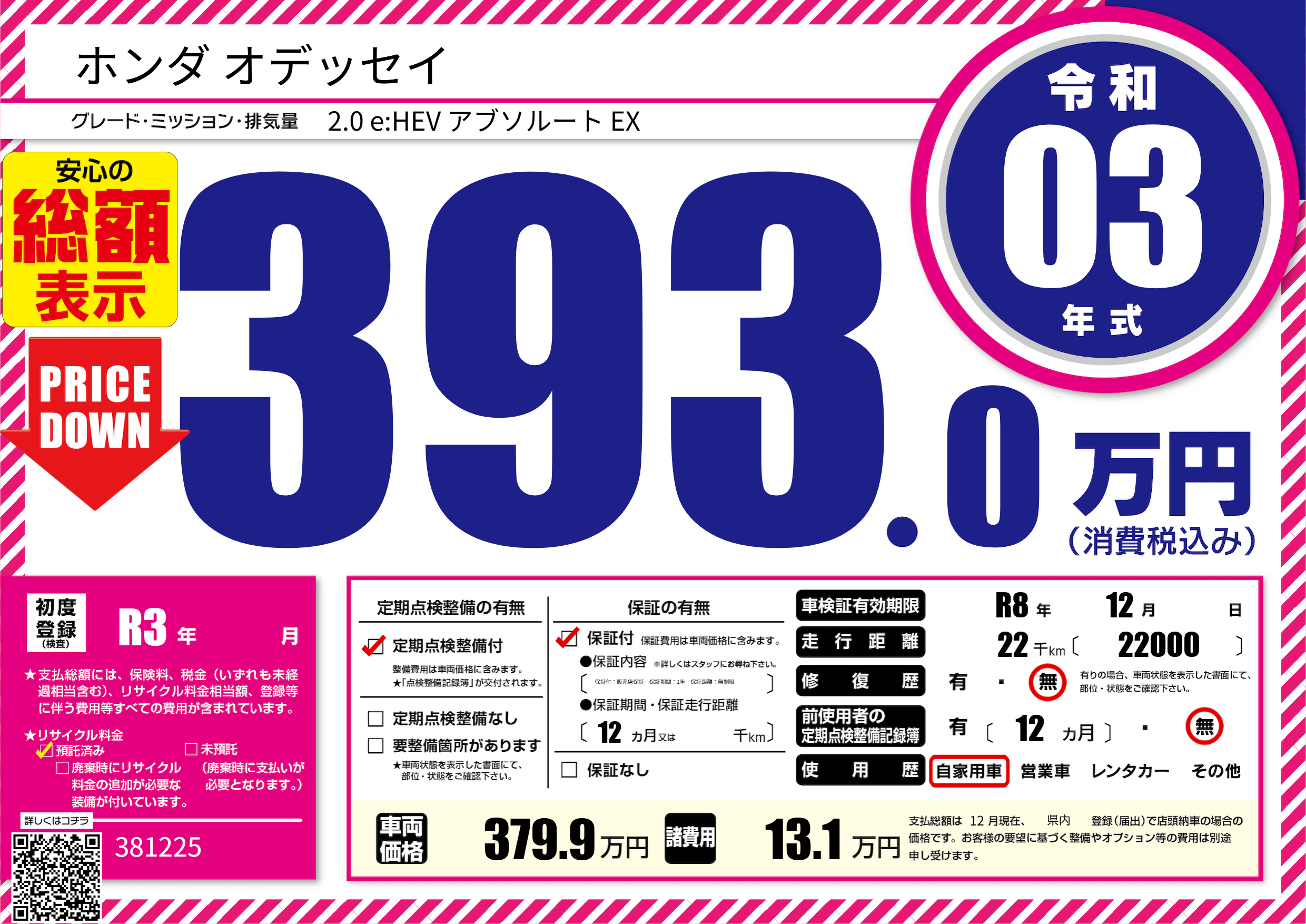 | 走行キロ | 2.2万km | 初年度登録 | R3年---月 |