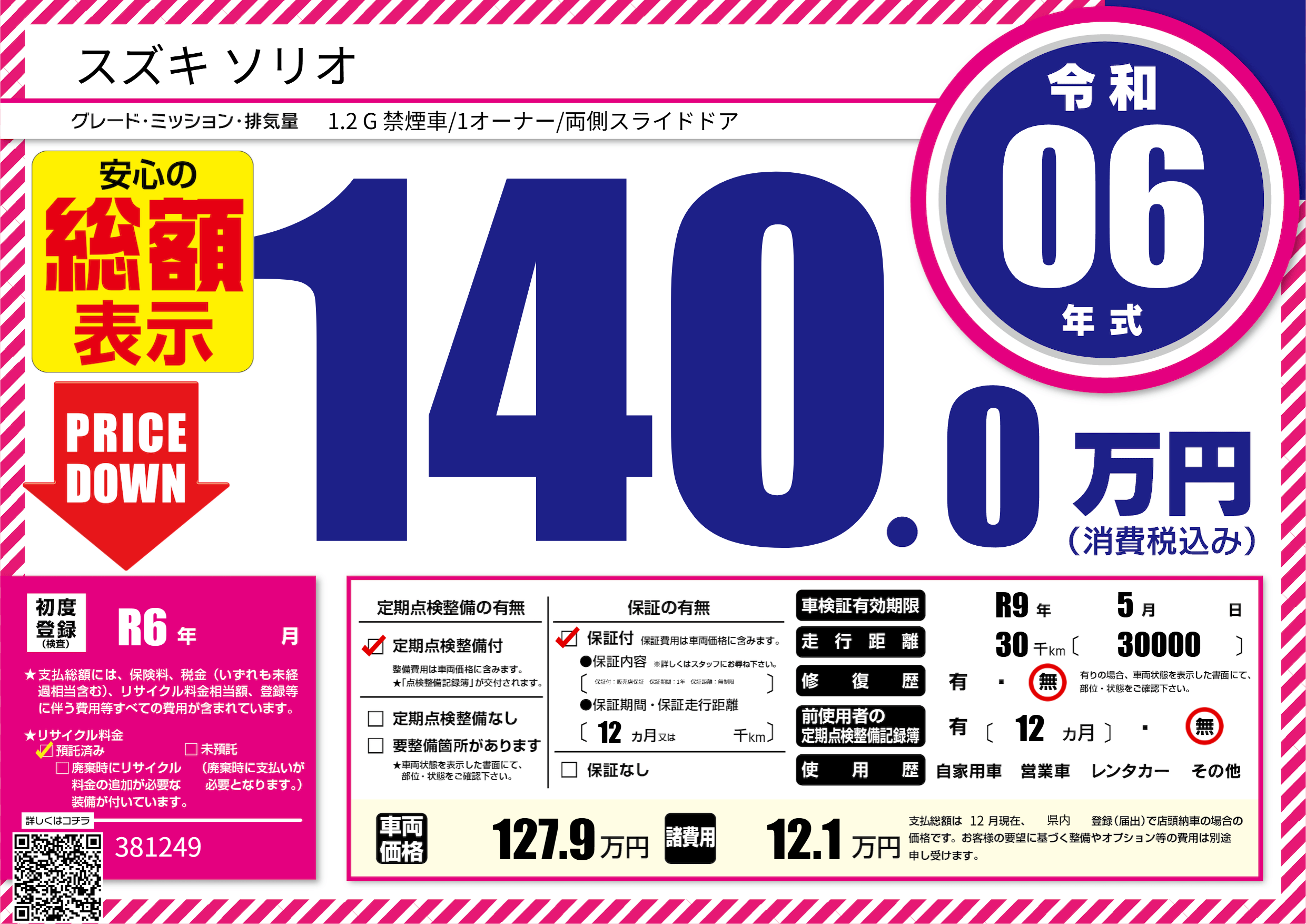 | 走行キロ | 3万km | 初年度登録 | R6年---月 |