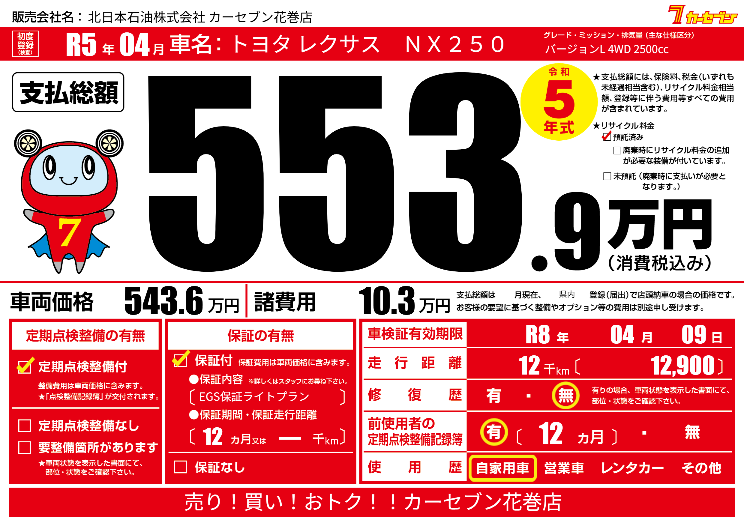 | 車検制限 | R8年 04月 09日 | ||