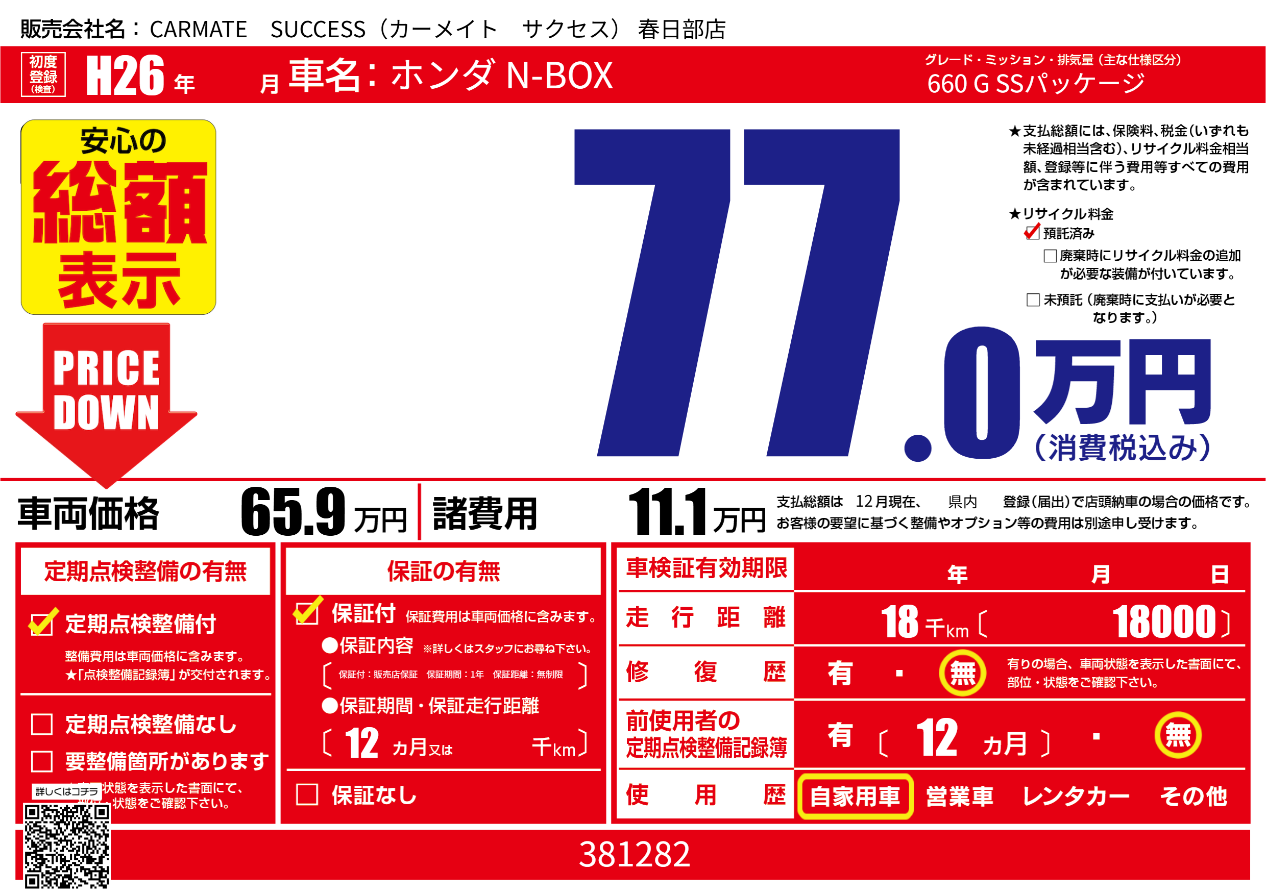保証なし 保証内容(保証付:販売店保証 保証期間:1年 保証距離:無制限) 12ヶ月または()千kmまで |