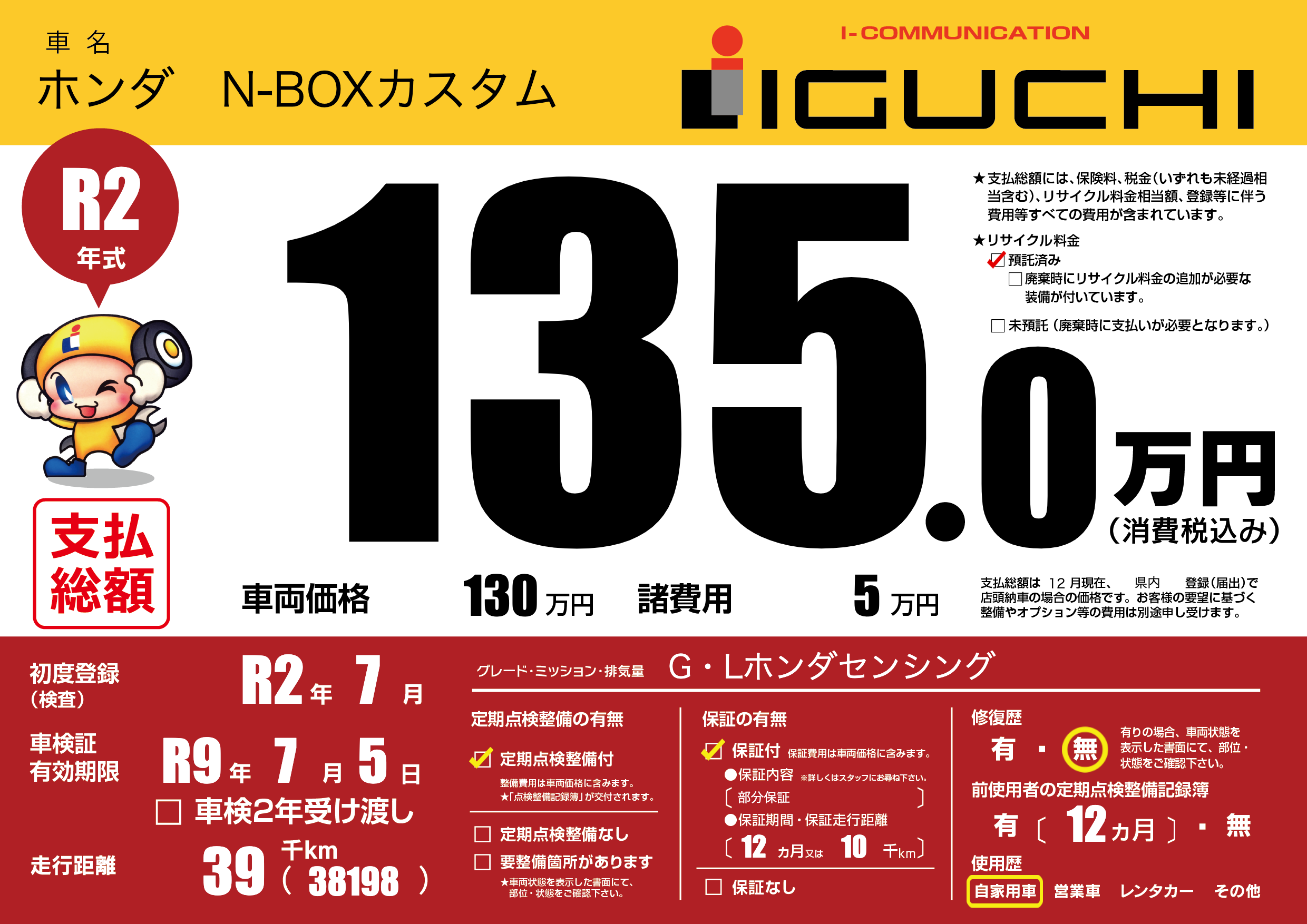 | 車名 | ホンダ N-BOXカスタム | グレード ミッション 排気量 |