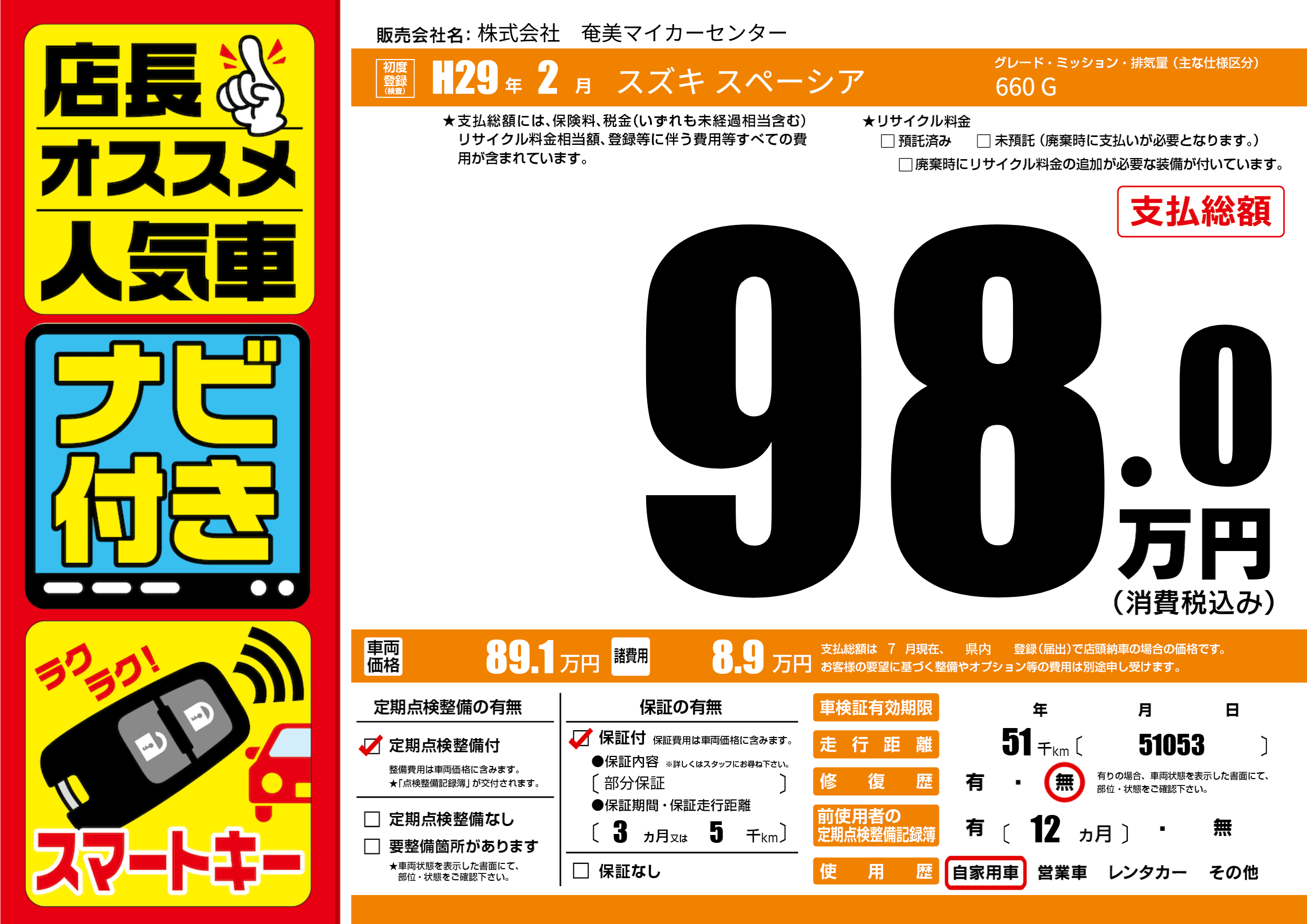 | 車名 | スズキ スペーシア | グレード ミッション 排気量 |
