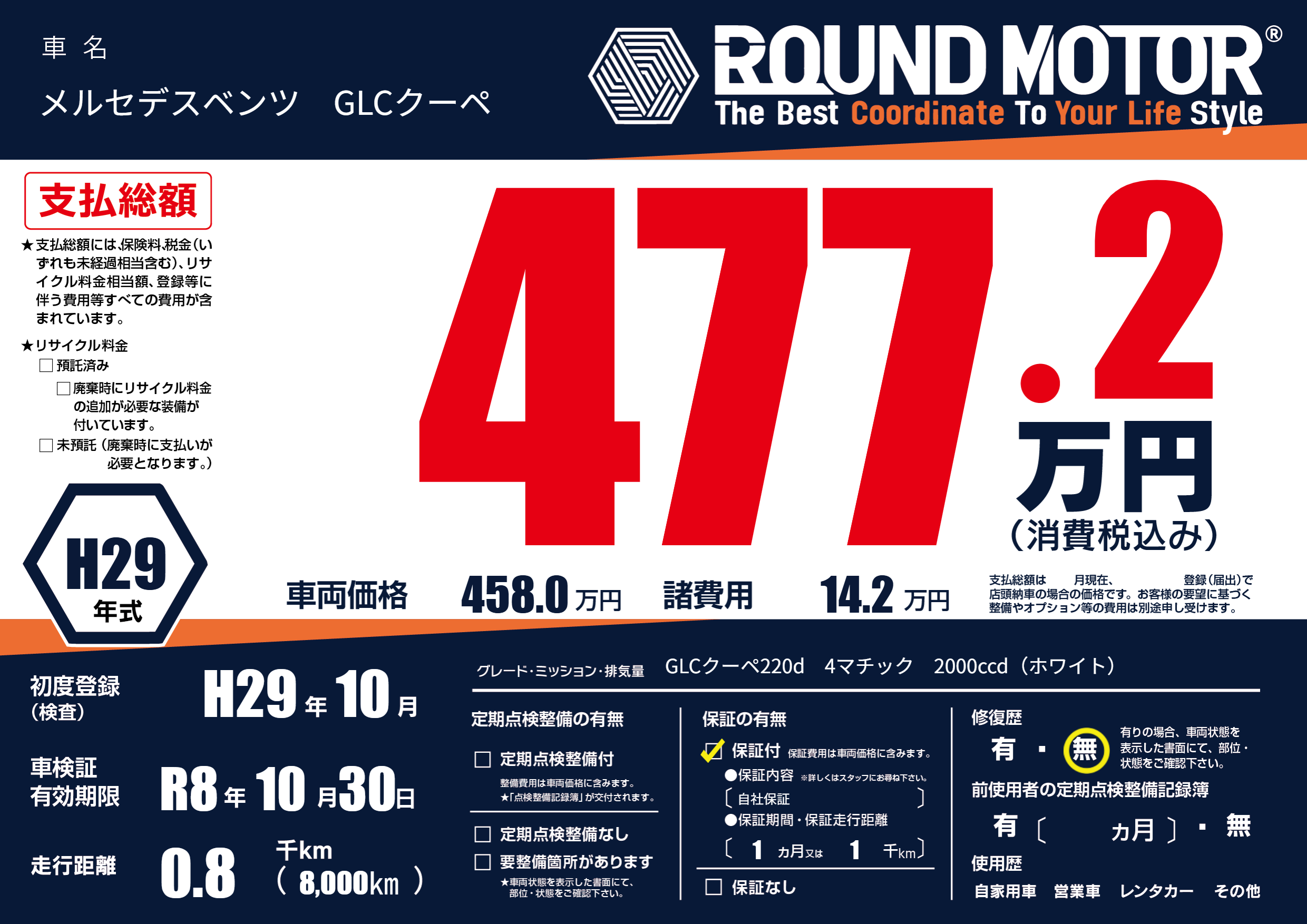 | 車名 | メルセデスベンツ GLCクーペ | グレード ミッション 排気量 |