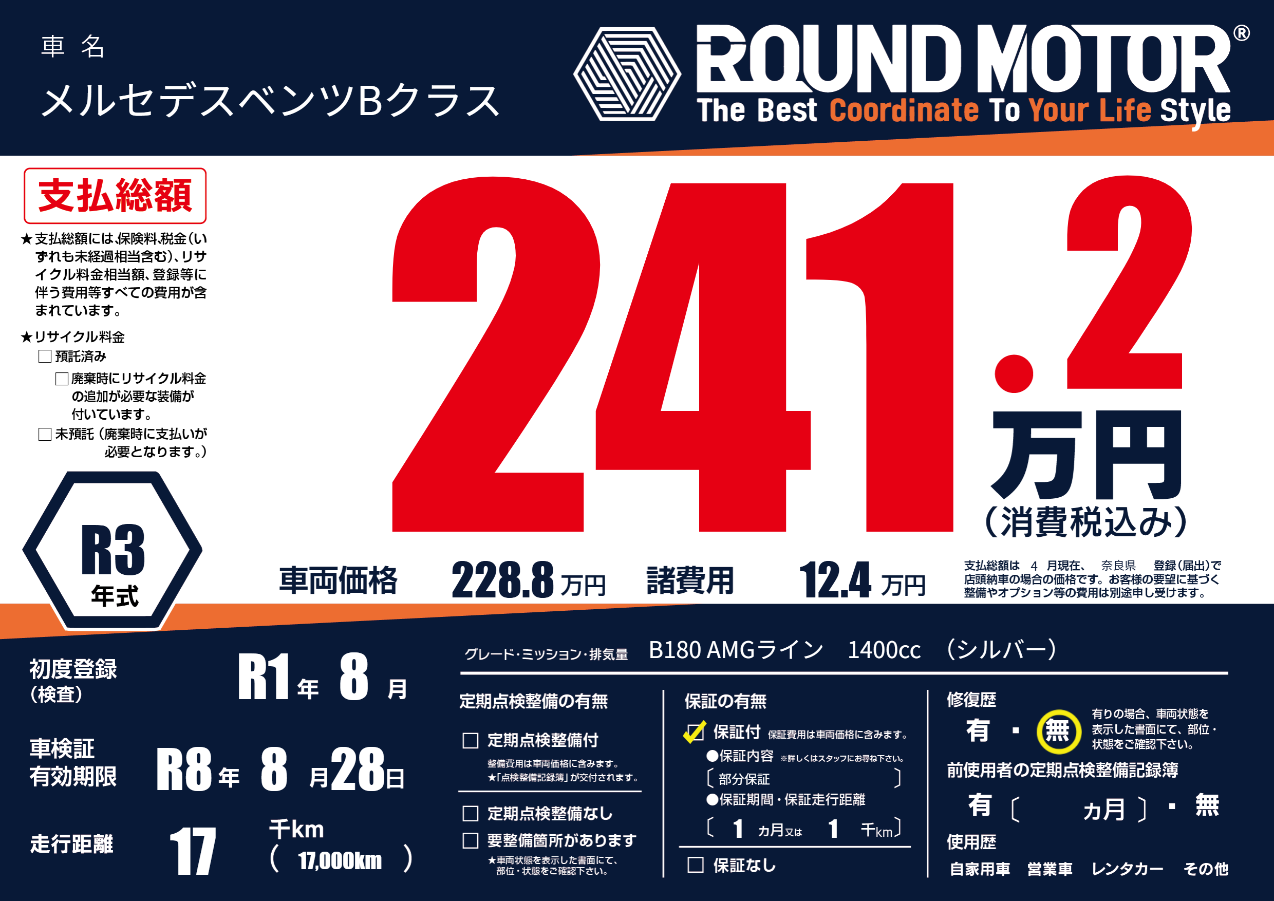 | 車名 | メルセデスベンツBクラス | グレード ミッション 排気量 |