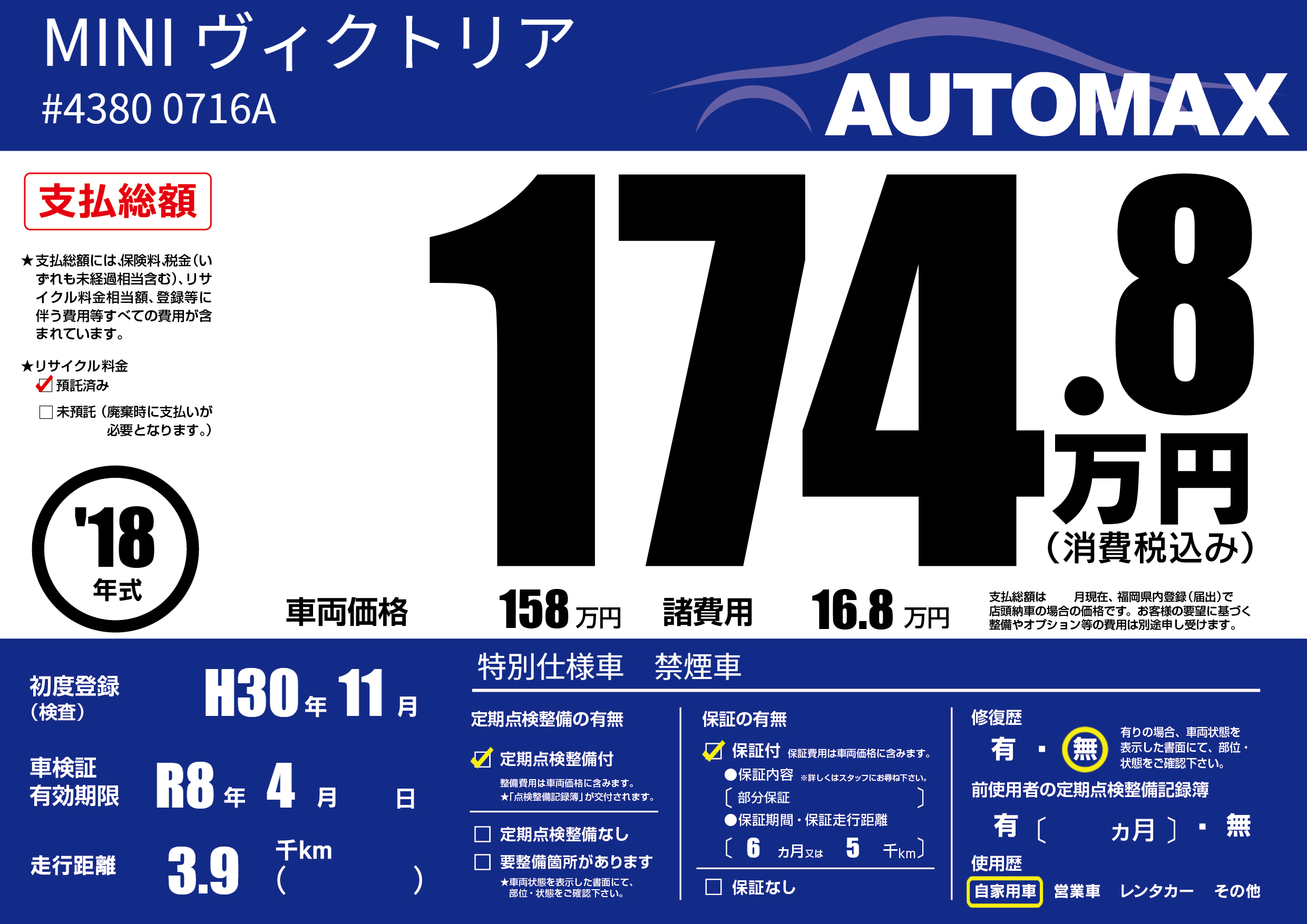 | 車検制限 | R8年 4月 - 日 | ||
