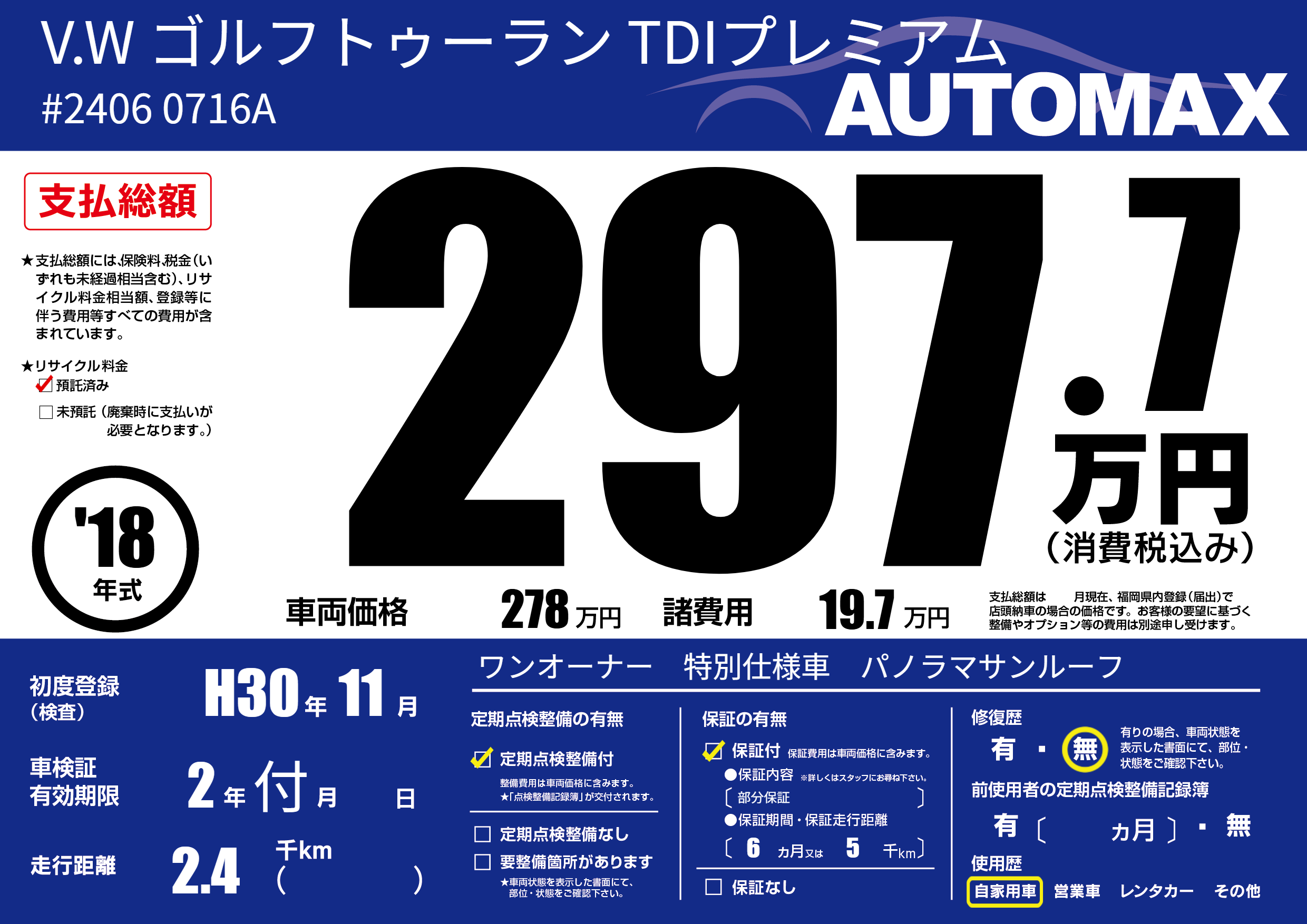 | 車名 | V.W ゴルフトゥーラン TDIプレミアム | グレード ミッション 排気量 |