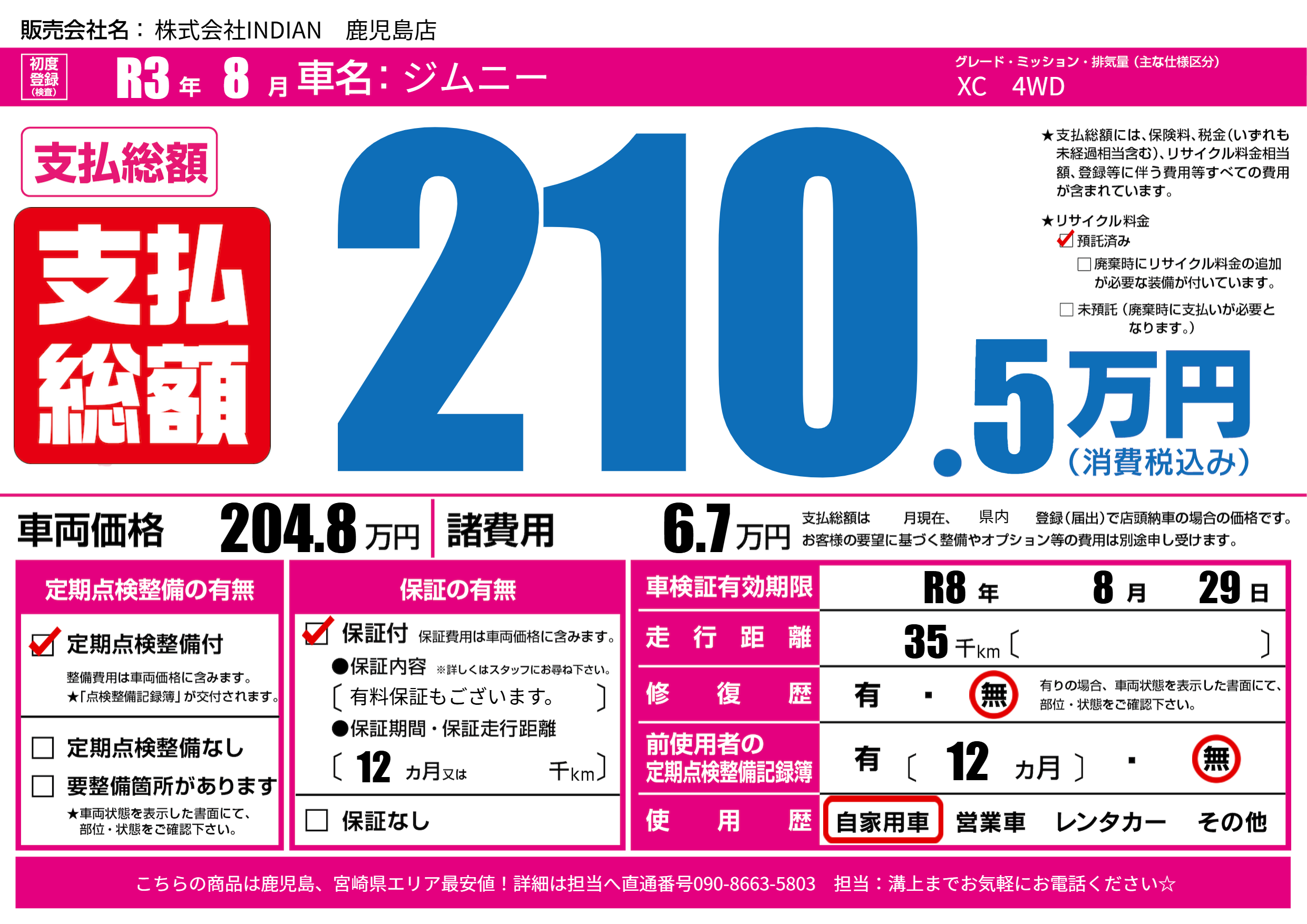 | 車名 | ジムニー | グレード ミッション 排気量 |